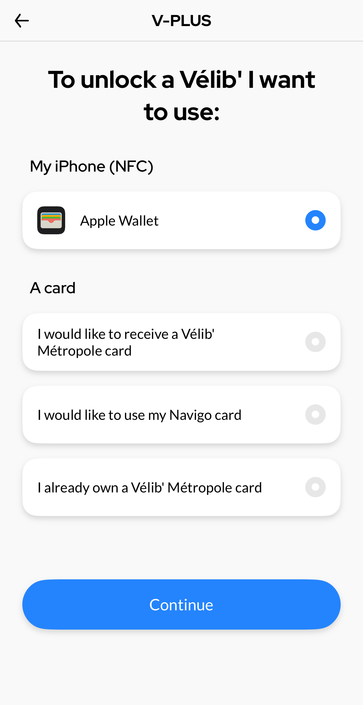 벨리브 어플에서 자전거 이용권을 결제하고 나면 자전거 잠금해제를 위한 수단을 선택할 수 있다. 아이폰 사용자라면 Apple Wallet을 선택하면 편하고 나비고나 벨리브 메트로폴카드가 있다면 이 카드를 이용해도 된다.