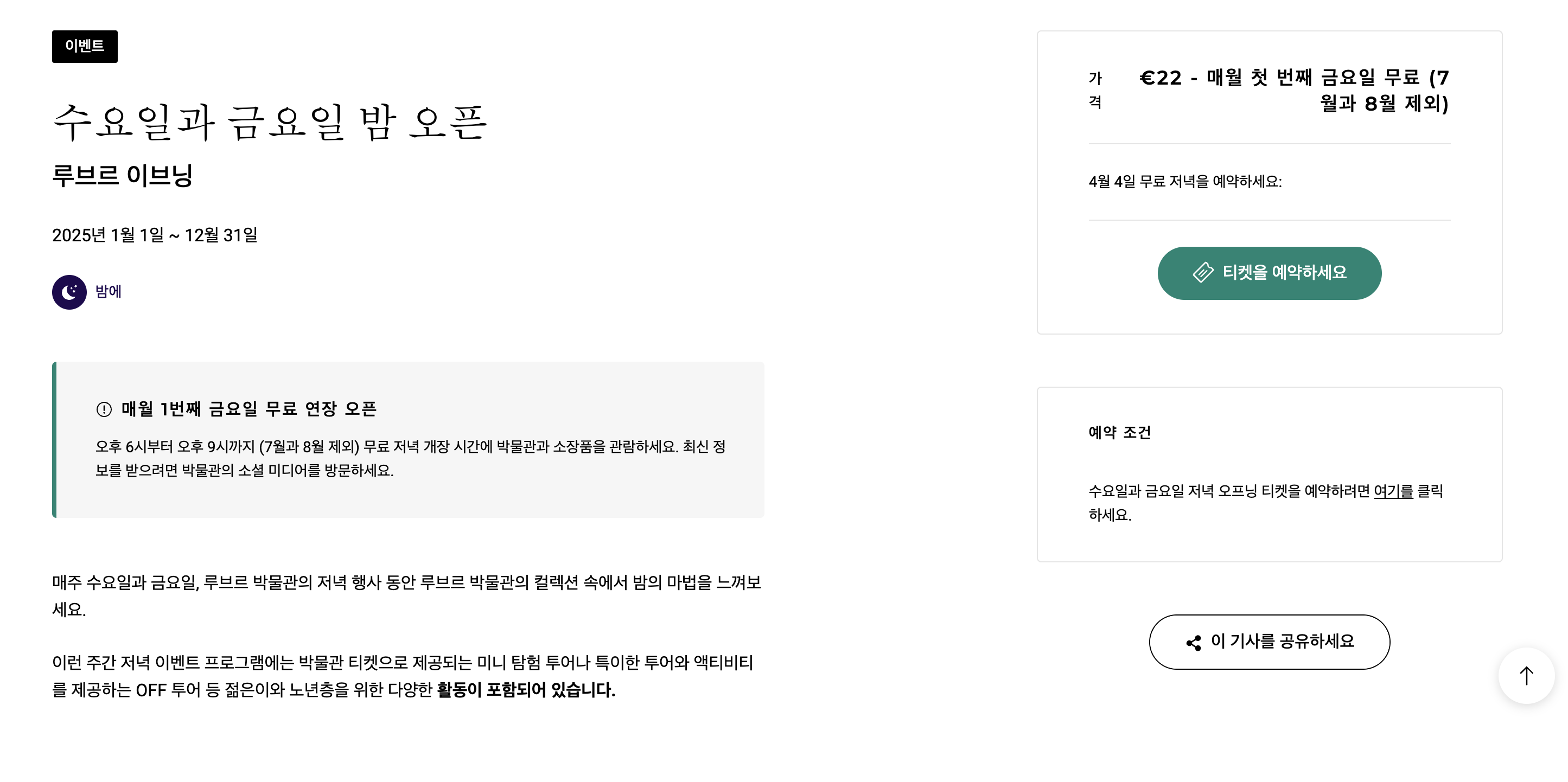 크롬으로 해당 사이트에 들어가니 바로 번역이 되는 바람에 '수요일과 금요일 밤 오픈'으로 표기되어 있는데 수요일은 아니고 금요일에 오픈한다. 다만 무료관람이라고 해도 예약은 해야 하기 때문에 예약까지 진행해보았다.