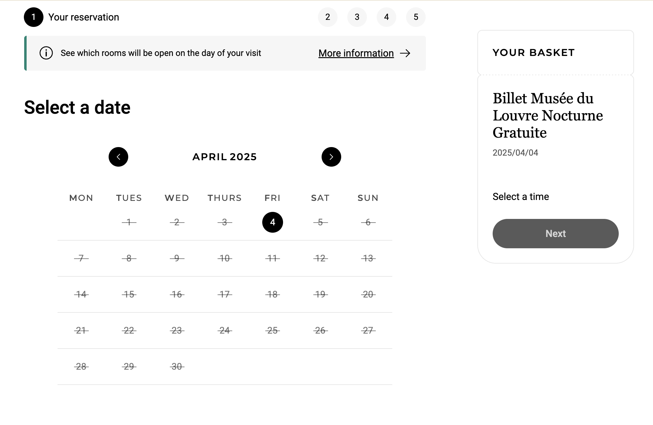 무료관람을 할 수 있는 날짜만 예약이 되므로 날짜를 선택한 후 NEXT를 누른다.