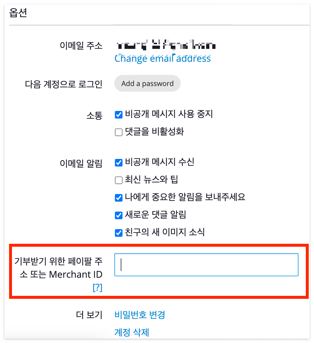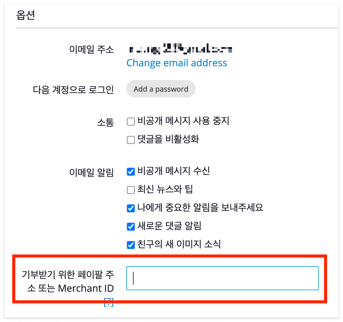 픽사베이에 사진을 등록하기 위해 가입을 하게 되면, 계정 설정에서 '기부받기 위한 페이팔 주소 또는 Merchant ID'를 입력하는 란이 나오게 됩니다. 여기에 페이팔 머천트 ID를 입력해놓으면 누군가 제 사진을 다운로드하고 기부를 했을 때, 제가 소정의 기부금을 받을 수 있게 되는 것이죠.