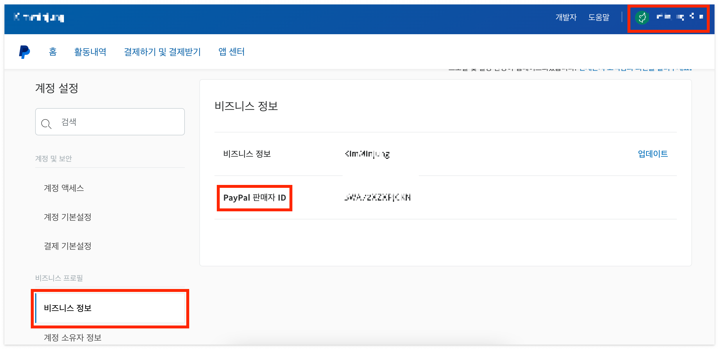 전환을 완료한 후, 다시 오른쪽 상단 이름을 클릭하여 '계정설정'으로 들어갑니다. 왼쪽 사이드바 하단의 '비즈니스 정보'를 클릭해보면 이제 PayPal 판매자 ID가 아래와 같이 나타납니다.