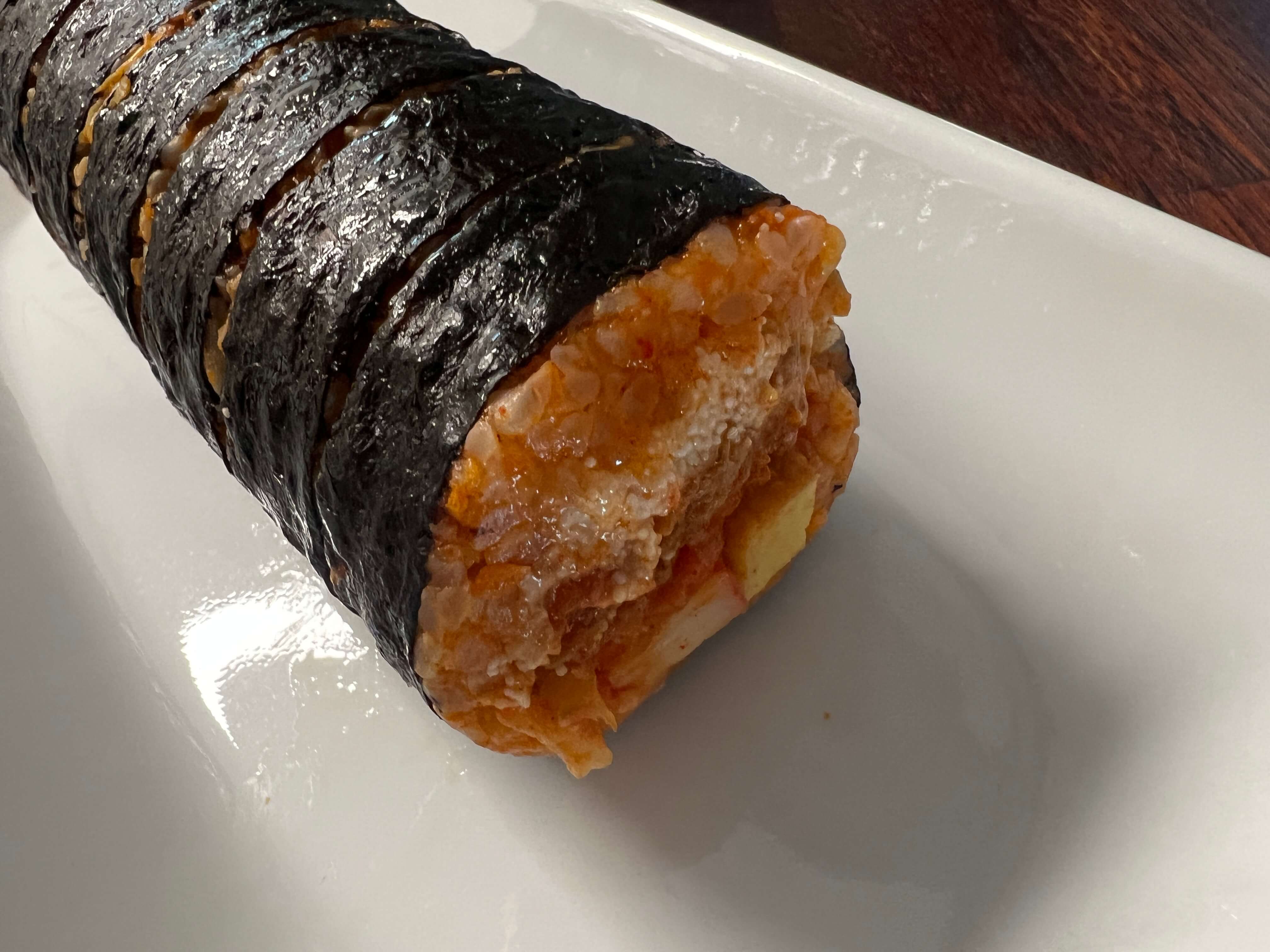 삼각김밥은 아이들이 다 먹어버려서 사진을 찍지 못했는데 명란제육김밥은 아이들이 하나도 먹지 않았더라구요. 아이들이 먹기에는 매운 감이 있었는데 매운 것을 잘 못 먹는 저도 별로 맛있다는 생각이 들지 않았어요. 매운 거 잘 못 드시는 분들께는 비추입니다. 하지만 편의점 김밥은 특성상 어쩔 수 없이 차고 밋밋한 느낌이 있는데, 그에 비해 빨간색으로 먹음직스러웠다는 점은 좋았던 것 같아요.