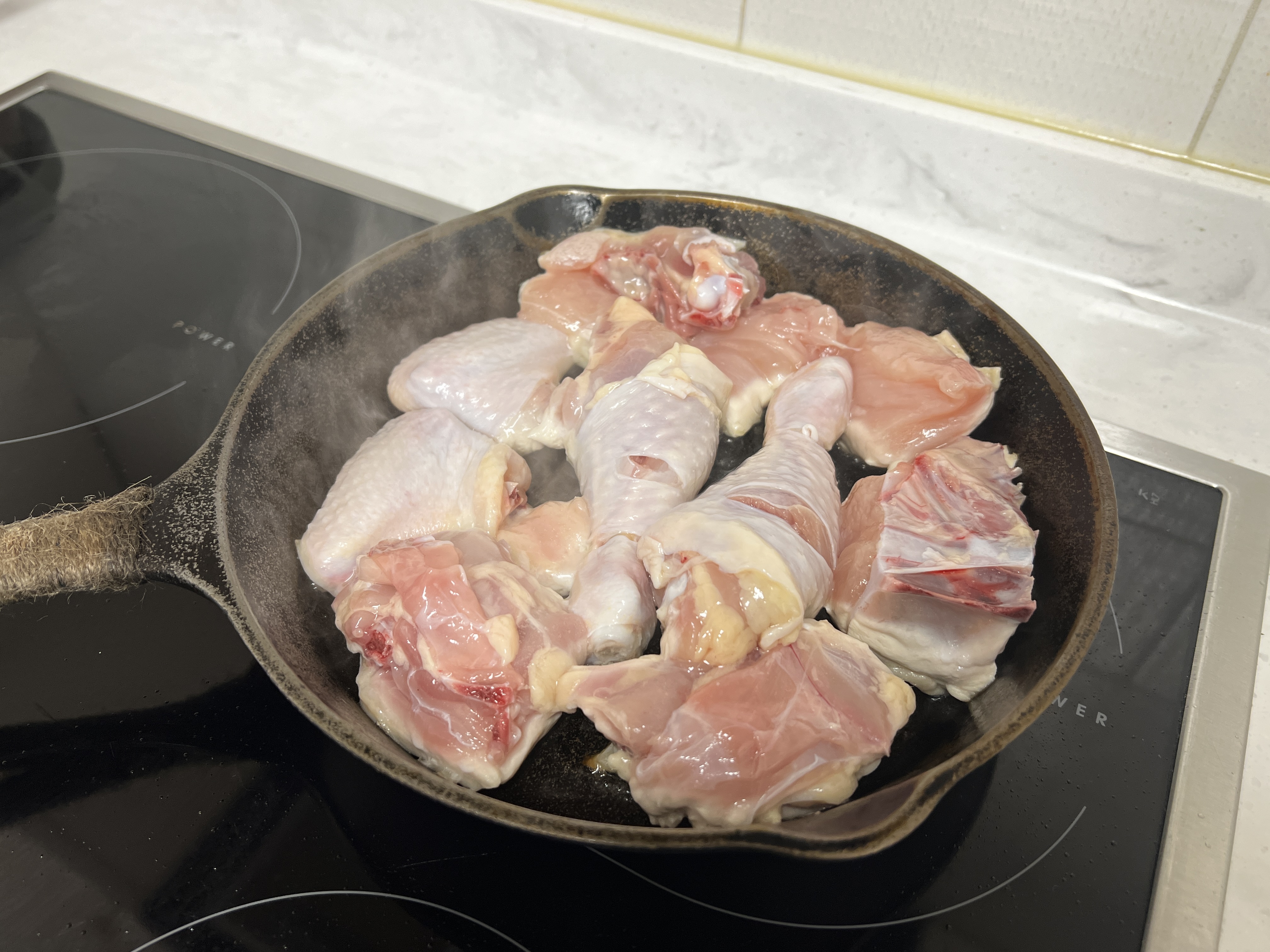 방법은 참 간단합니다. 키친타올로 물기를 잘 제거한 닭을 달궈둔 팬 위에 하나씩 올려줍니다. 저는 집에서 로지 무쇠팬을 매우 즐겨 사용하는 편이라 이번에도 로지 무쇠팬을 사용해 보았습니다. 기름이 있는 부분을 아래쪽으로 향하게 먼저 구워주면 됩니다.