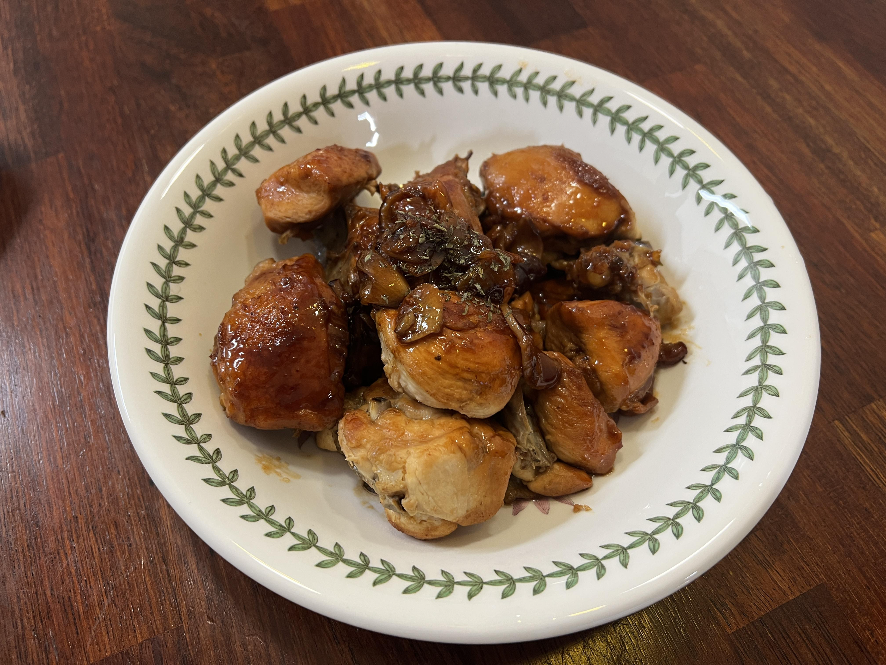 굽다 보면 이렇게 닭에서 기름이 나와 노릇노릇하게 구워집니다. 원래의 레시피라면 여기에 파를 잔뜩 넣었던 것 같은데, 이 날따라 집에 파가 똑 떨어진지라 그냥 마늘만 살짝 슬라이스해서 넣어주었습니다. 여기에 설탕을 넣고 간장을 벽 쪽으로 넣어 살짝 끓여준 후, 닭에 입혀줍니다.