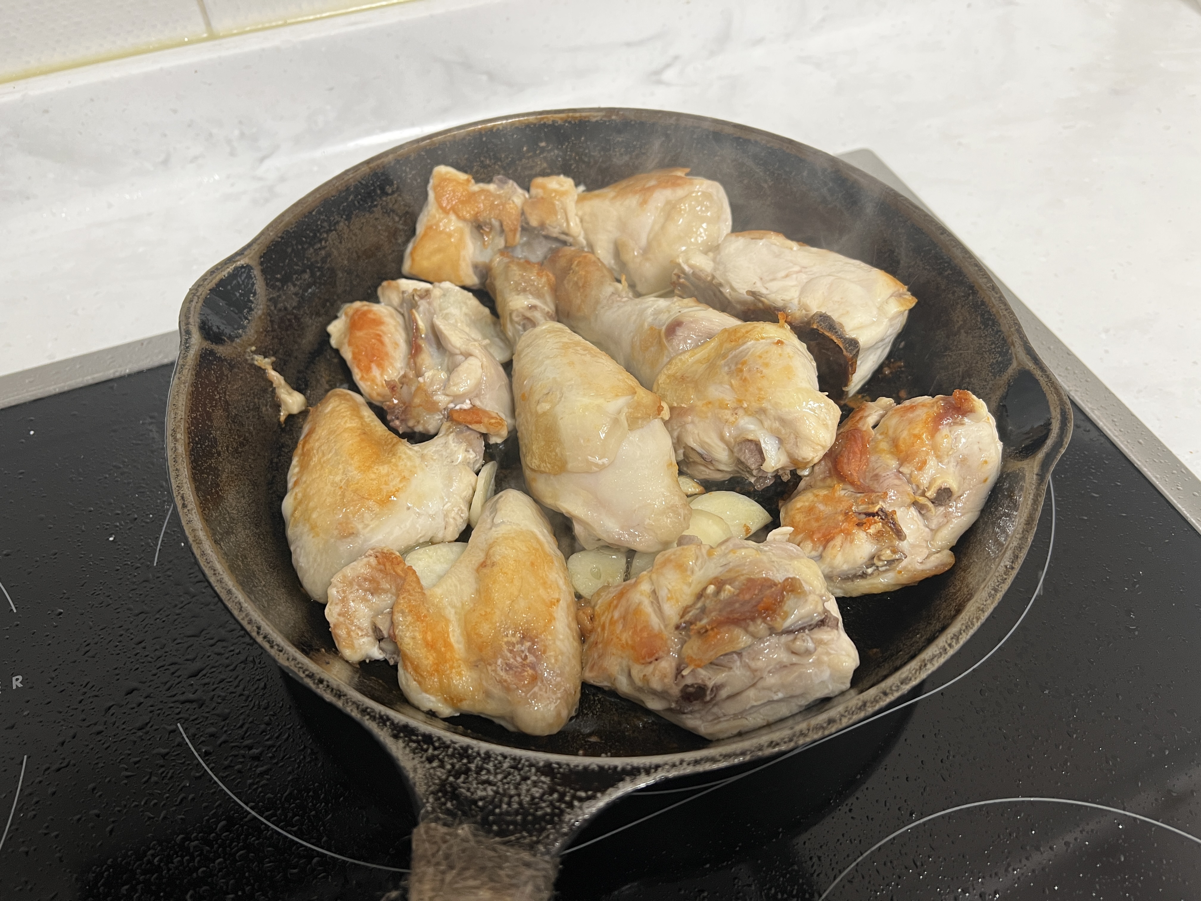 방법은 참 간단합니다. 키친타올로 물기를 잘 제거한 닭을 달궈둔 팬 위에 하나씩 올려줍니다. 저는 집에서 로지 무쇠팬을 매우 즐겨 사용하는 편이라 이번에도 로지 무쇠팬을 사용해 보았습니다. 기름이 있는 부분을 아래쪽으로 향하게 먼저 구워주면 됩니다.