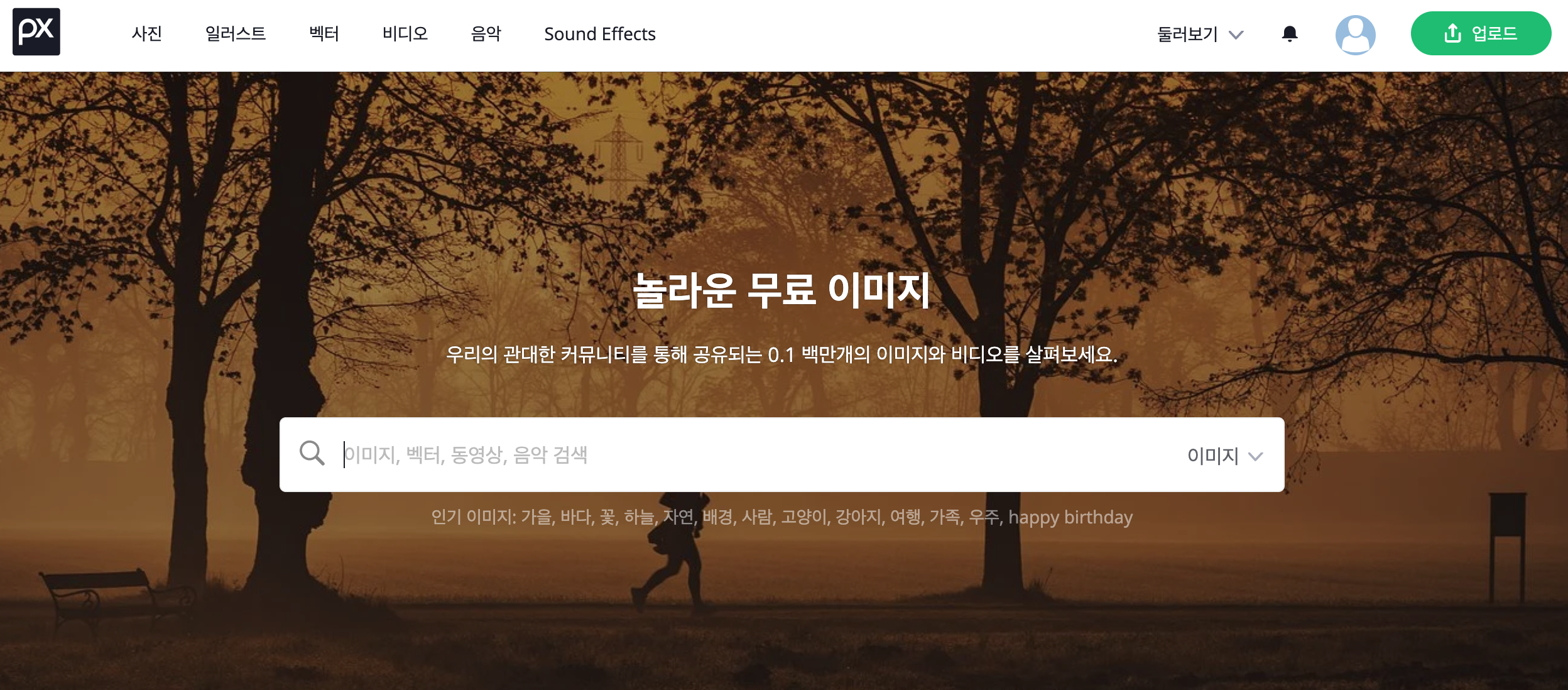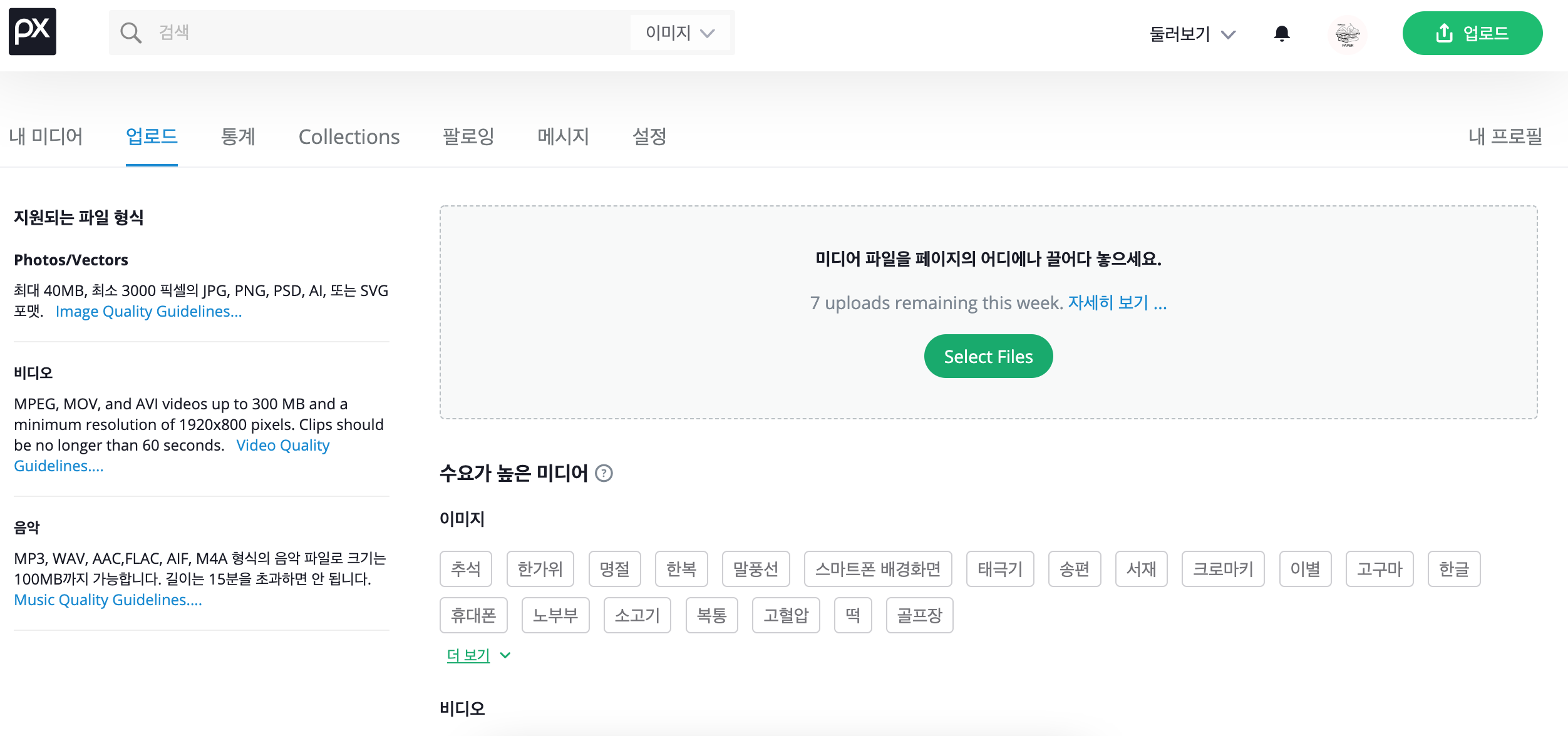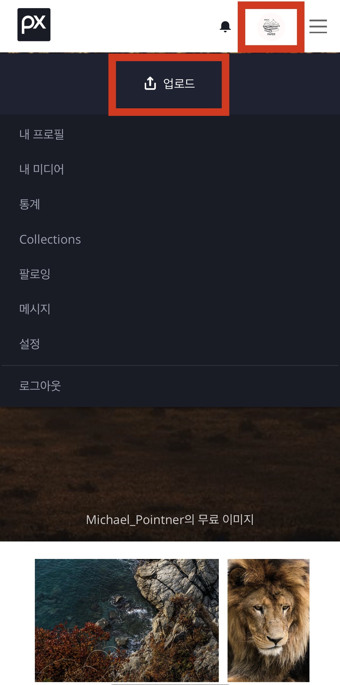 픽사베이 어플 다운 - 상단 프로필 아이콘 - 업로드