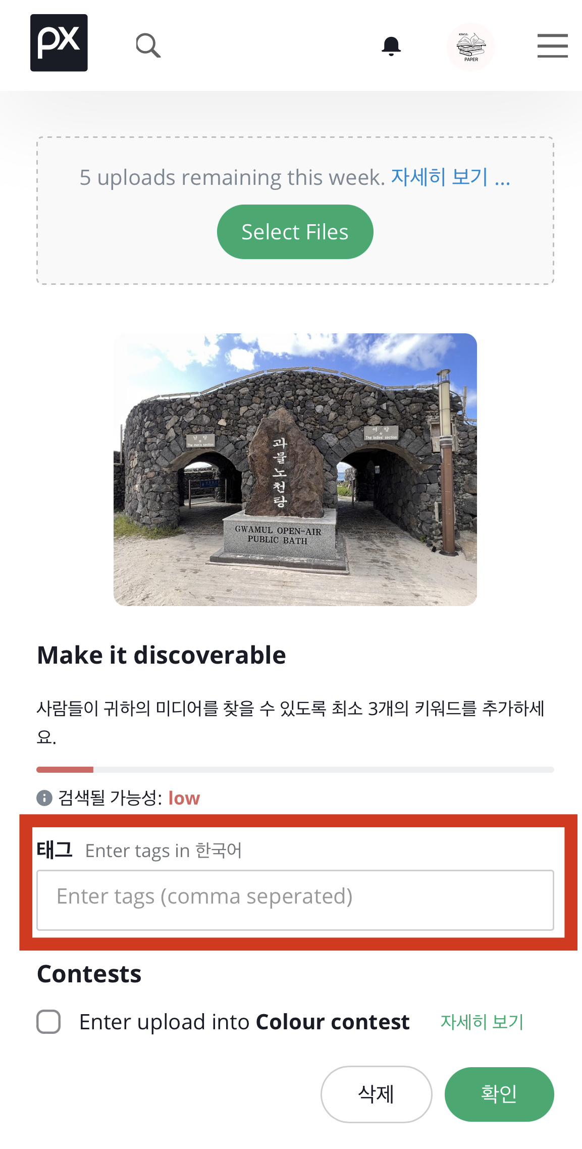 내 사진에 붙일 태그를 여러개 입력해줍니다. 많이 붙일수록 검색 확률이 높아지니 다양한 태그를 붙여봅니다. 업로드된 이미지는 승인 과정을 거쳐서 게시되는데요, 어제 올려둔 사진 한 장은 이미 승인되어 게시가 시작되었고, 오늘 올린 사진은 아직 승인이 되지 않았네요. 승인이 완료되면 '내 미디어'에서 확인하시면 된답니다.