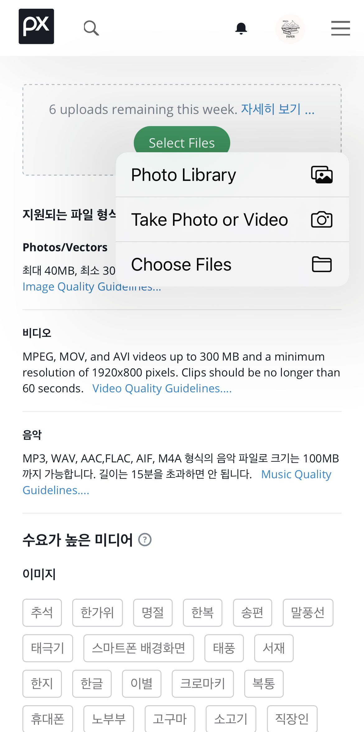 픽사베이 어플 다운 - 상단 프로필 아이콘 - 업로드