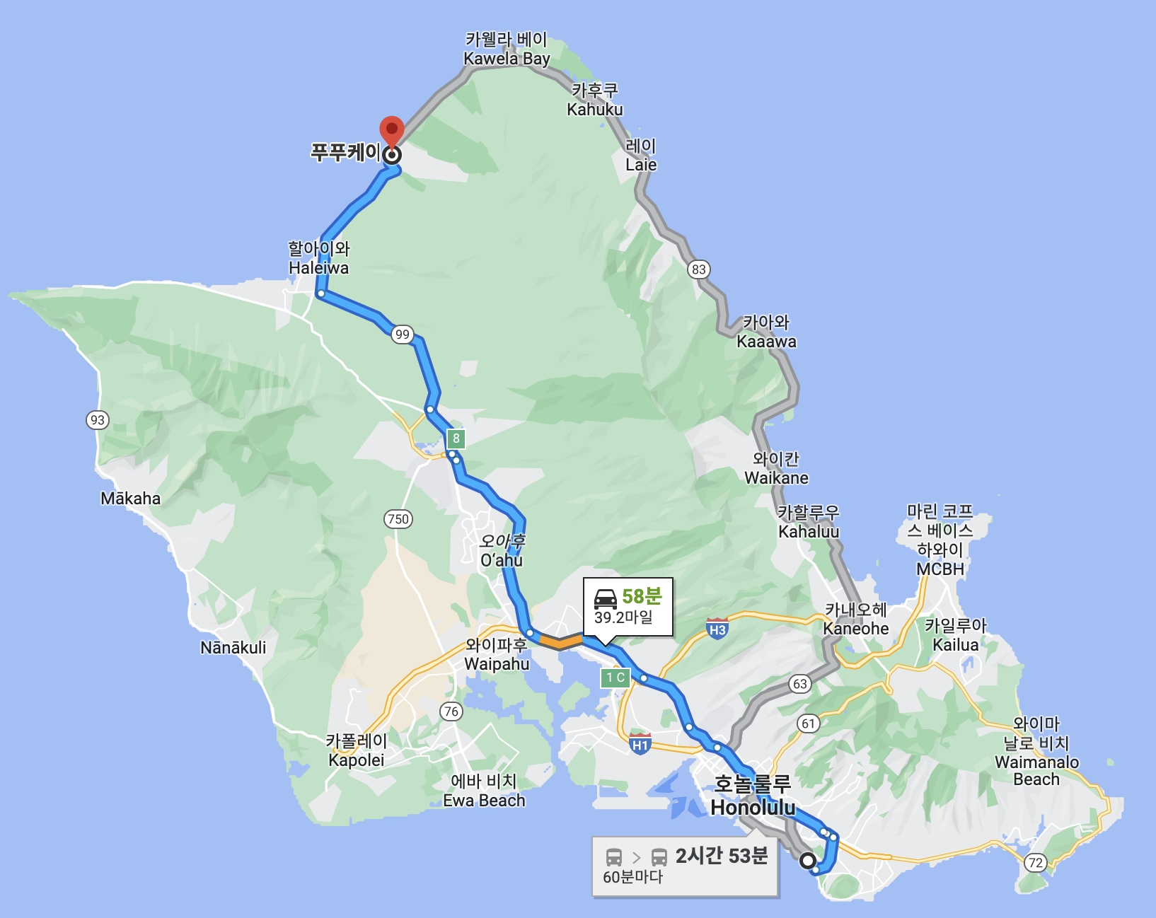 와이키키 해변에서 약 1시간 남짓 자동차로 달렸는데, 지치지 않고 빨리 물놀이를 하려는 마음에 가급적 가다가 여기저기 들를 수 있는 해안도로를 선택하지 않고 내륙도로로 바로 가 봅니다. 가다가 맞닥뜨린 도로공사만 아니었어도 조금 더 빨리 갈 수 있었을텐데 아쉽게도 1시간 20분정도 걸린 것 같네요.