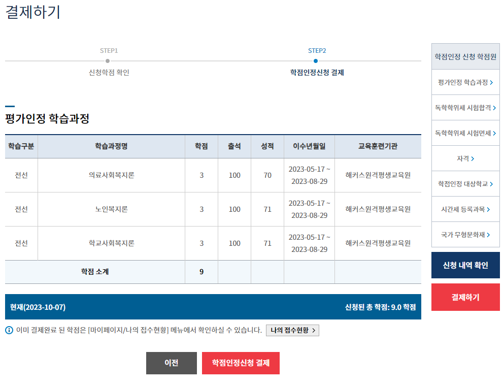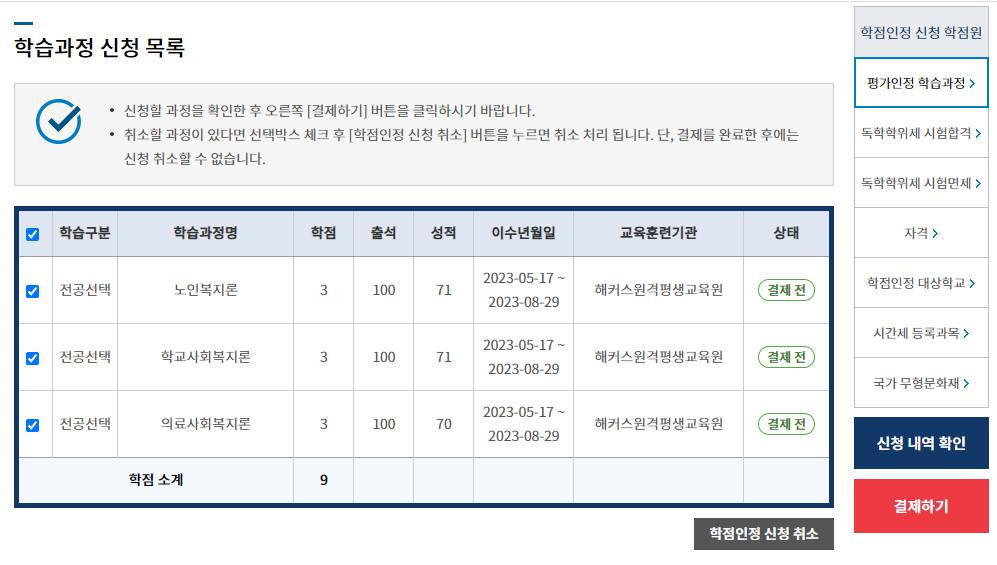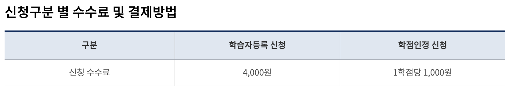 신청시 수수료가 있는데, 학습자등록은 4,000원 / 학점인정은 1학점당 1,000원입니다. 계좌이체나 신용카드 결제도 가능하기 때문에 편한 방법으로 결제하시면 됩니다. 저는 이번에 3과목을 등록하였는데 총 9학점이기 때문에 9,000원을 납부하였습니다.
