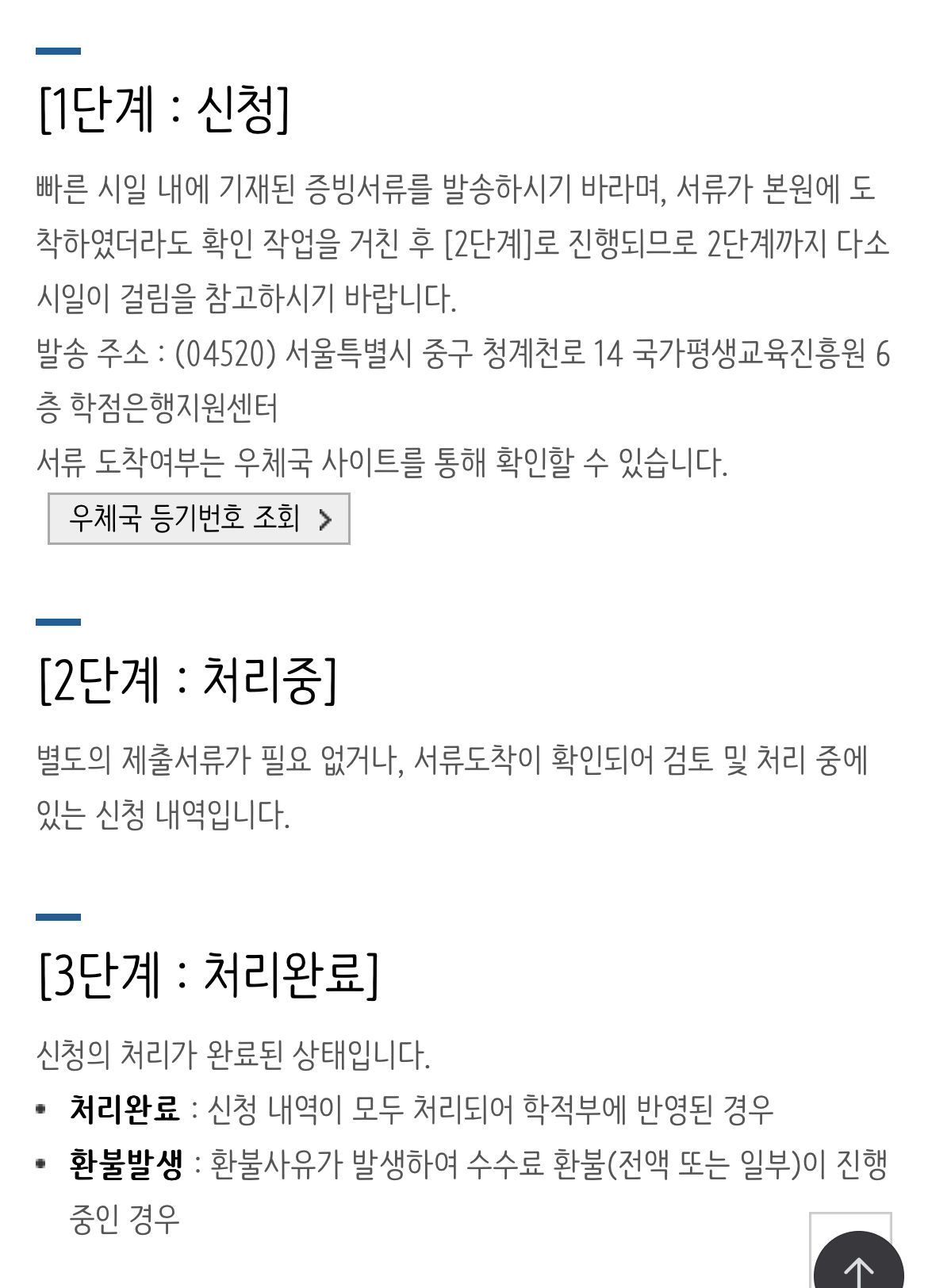 빨간 글씨로 증빙서류 접수에 대한 안내가 있어 발송할 서류가 있는지 찾아보니 온라인으로 기관에서 이수한 학점을 신청한 경우라면 따로 발송할 서류가 없다고 하네요. 혹시 모르기 때문에 진행상황이 [처리중]으로 되어있는지 확인해보시면 좋을 것 같습니다. 만약 처리상태가 [처리중]으로 나온다면 별도의 서류제출이 필요하지 않다고 하니 따로 서류를 우편으로 송부하지 않으셔도 됩니다.