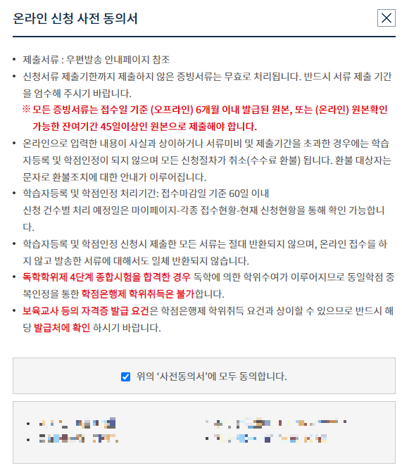 신청을 마치고 나면 신청한 학습과정명 옆에 모두 체크해주시고 결제를 해주셔야 합니다. 하단에 [학점인정신청 결제] 버튼을 클릭하시면 결제하기로 넘어갑니다. 결제는 1학점당 1,000원이기 때문에 저는 9,000원을 결제해주었습니다. 신청을 마치고 나면 아래와 같이 [온라인 신청 사전 동의서]가 나오게 됩니다. 동의합니다에 체크하시고 하단에 [확인] 버튼을 눌러주시면 학점인정신청은 끝입니다.