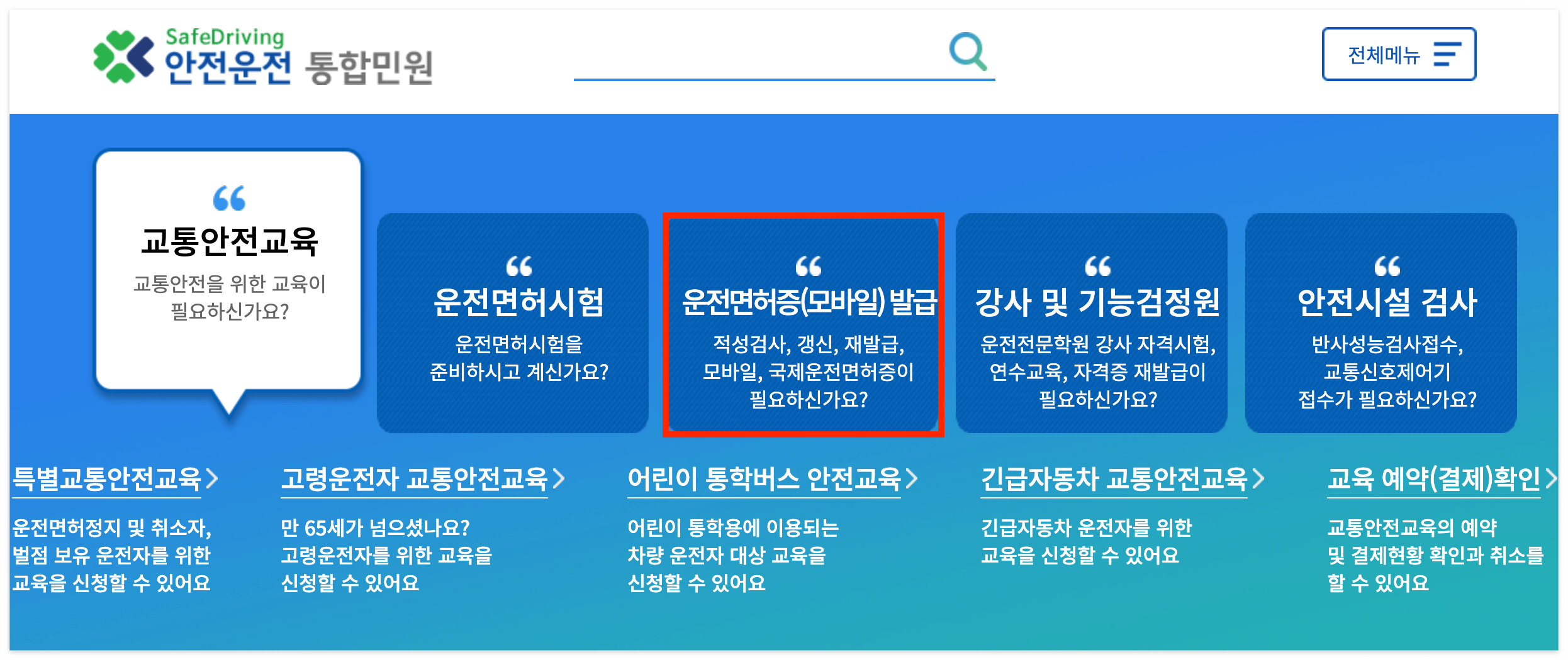 - 상단의 '운전면허증(모바일) 발급' 클릭