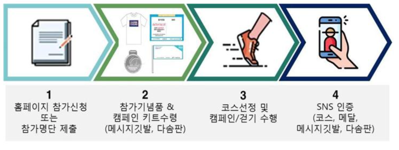 홈페이지에서 간단히 참가신청을 한 후, 9월 1일부터 순차적으로 참가기념품과 캠페인 키트가 발송됩니다. 미션 수행기간은 9월 1일부터 9월 30일까지이므로 기간 내에 원하는 코스를 선정하여 캠페인을 진행하고 걷기를 수행하면 됩니다.