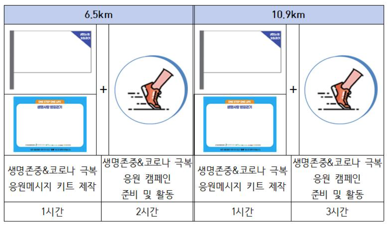 봉사확인증, 완보증 발급이 필요한 경우(사진 2장 필요) 생명존중 응원 메시지 키트에 응원문구 작성 사진과 다솜판 부착 후 거리를 걷고 러닝 어플 화면이 보이게 스마트폰을 들고 찍은 사진을 홈페이지에 업로드하여 인증하고, 인증 확인 후 봉사확인증과 완보증을 출력할 수 있습니다.