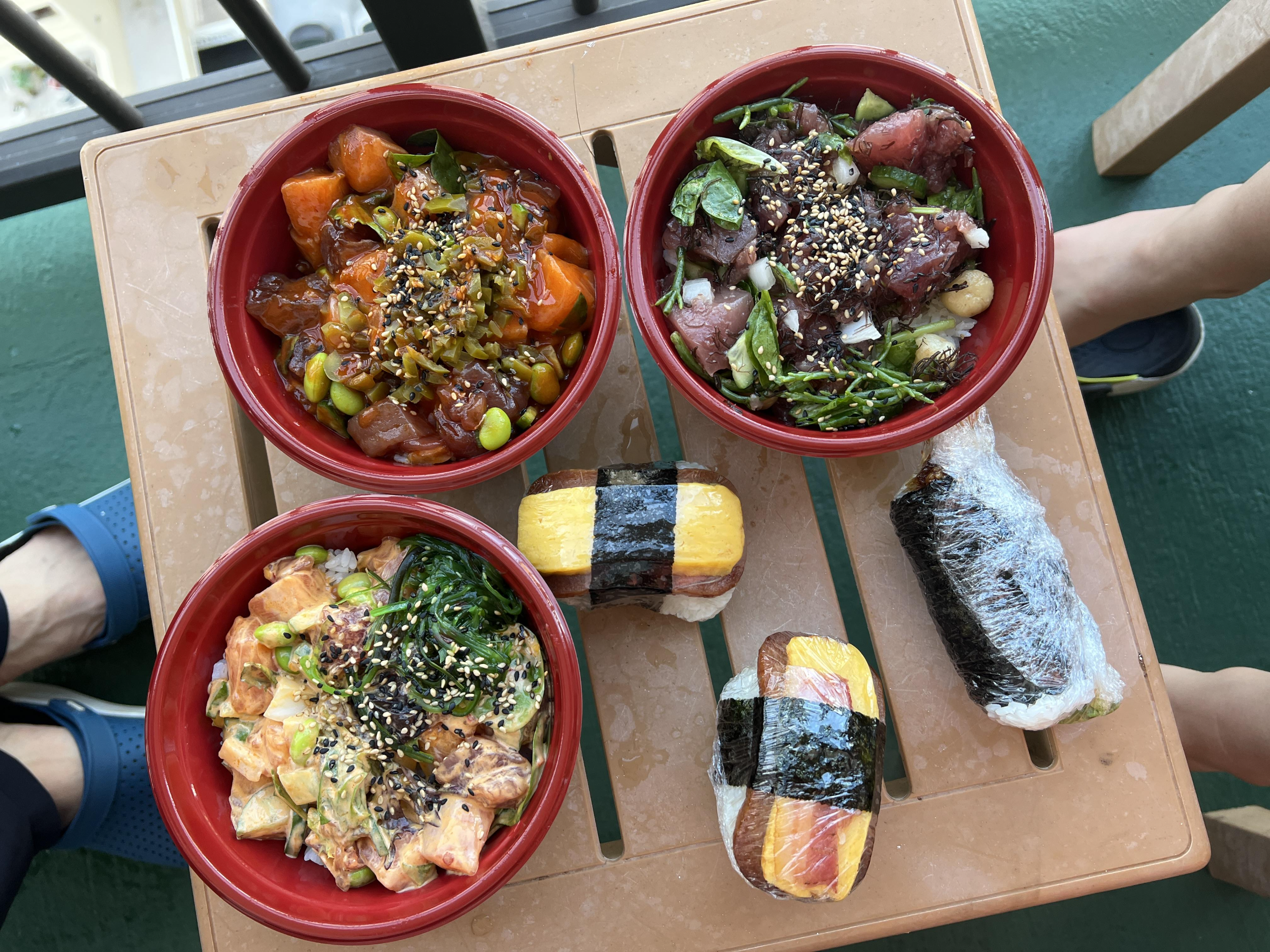 어느 블로그에선가 봤던 포케 맛집이 와이키키 리조트 근처에 있기에 한번 가봅니다. 와이키키 리조트에서 약 2블럭 정도 뒤로 돌아가면 있는 작은 포케집인데 구글에도 나오고 하와이를 소개하는 많은 여행블로거들의 블로그에도 자세한 후기가 있더라고요. 별생각 없이 가서 오늘의 스페셜 3개를 모두 포장했는데, 개인적으로 모두 맛있었지만 2가지는 매운맛이 있어서 아이들이 먹기는 힘들었어요.