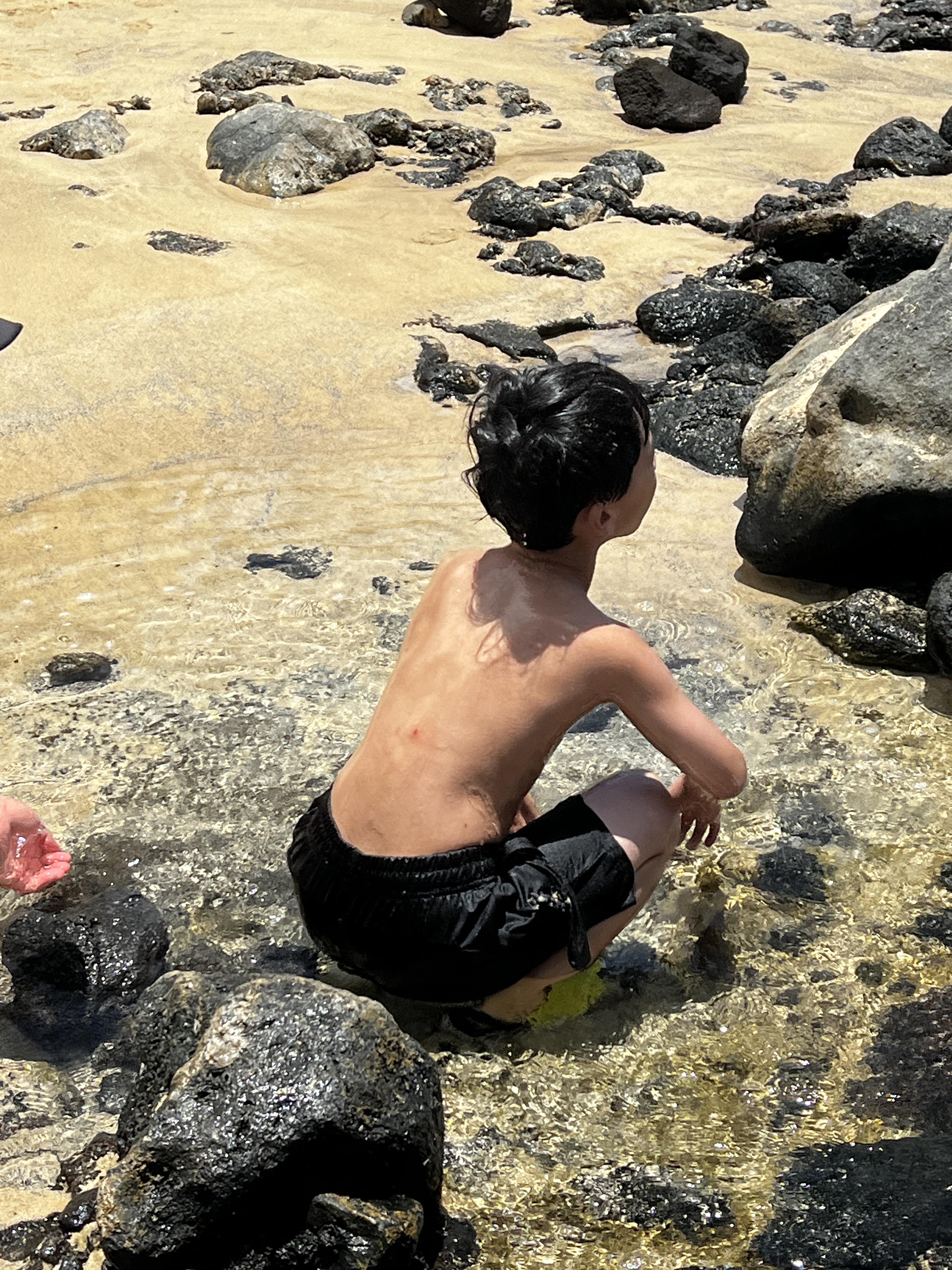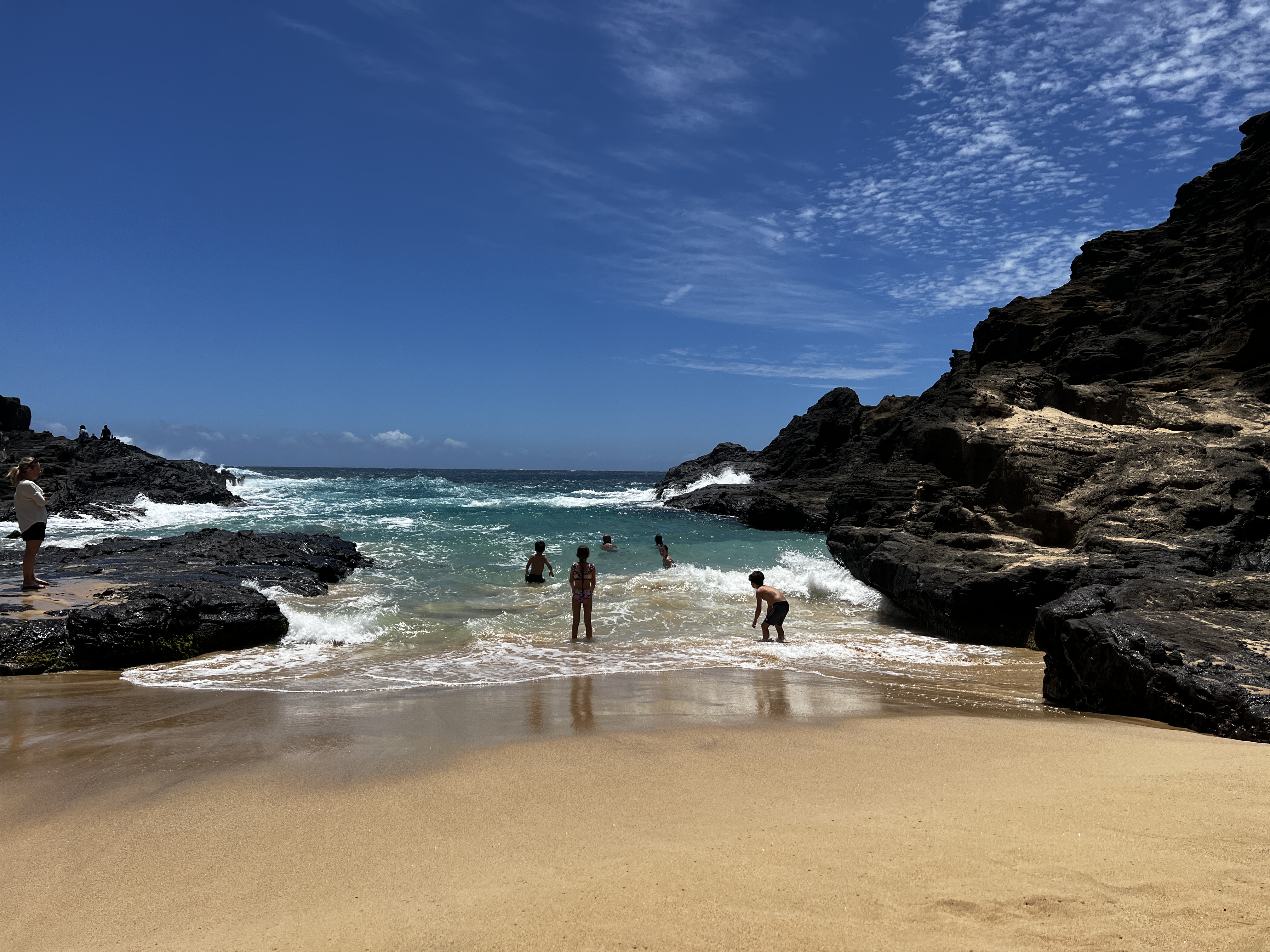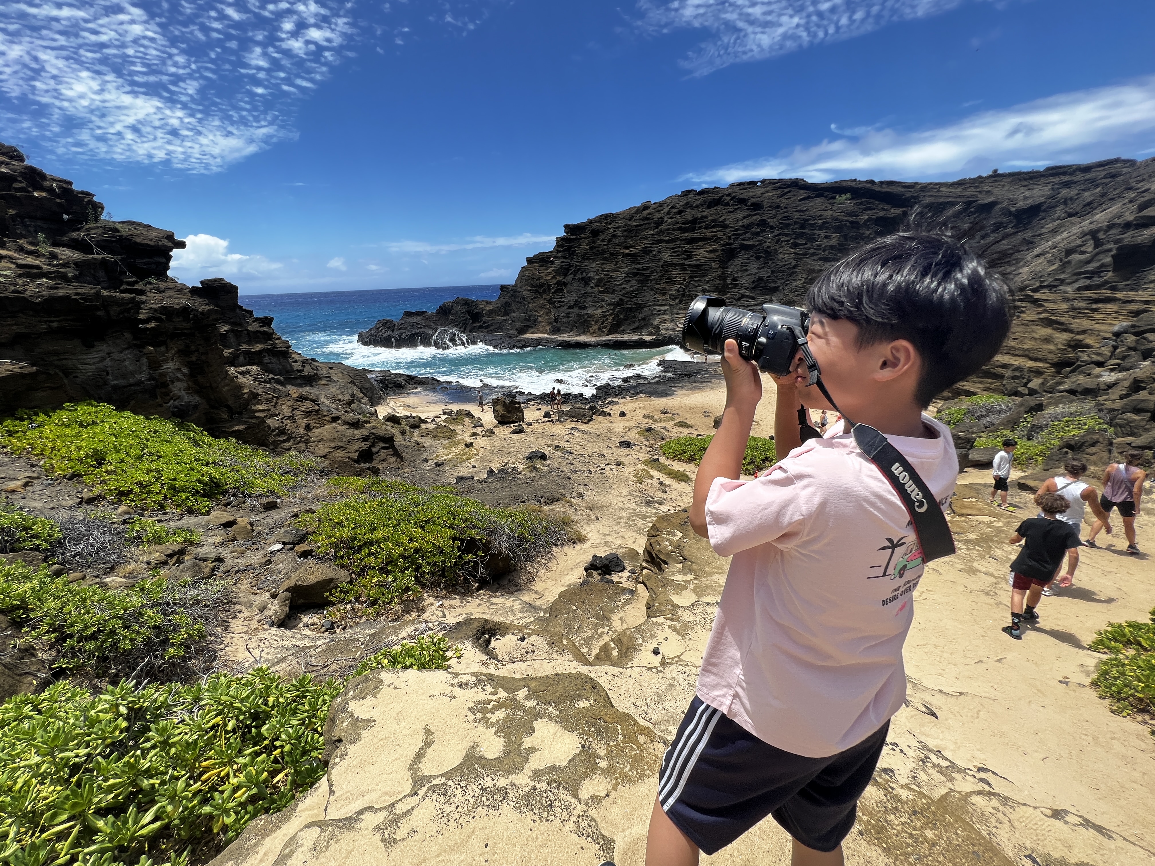 조금 더 지나가다보니 하와이에 오기 전 살펴봤던 여행 유튜버의 채널에서 본 블로우 홀이 보여서 무작정 내려가봅니다. 처음에는 블로우홀인지 모르고 사진 찍는 포인트인줄 알았는데, 사람들이 아래로 아래로 내려가기에 한번 내려가보니 블로우 홀이더라구요. 둘째님께서 이 전부터 열이 나기 시작했지만 바다를 보니 또 신나서 뛰쳐내려갑니다.