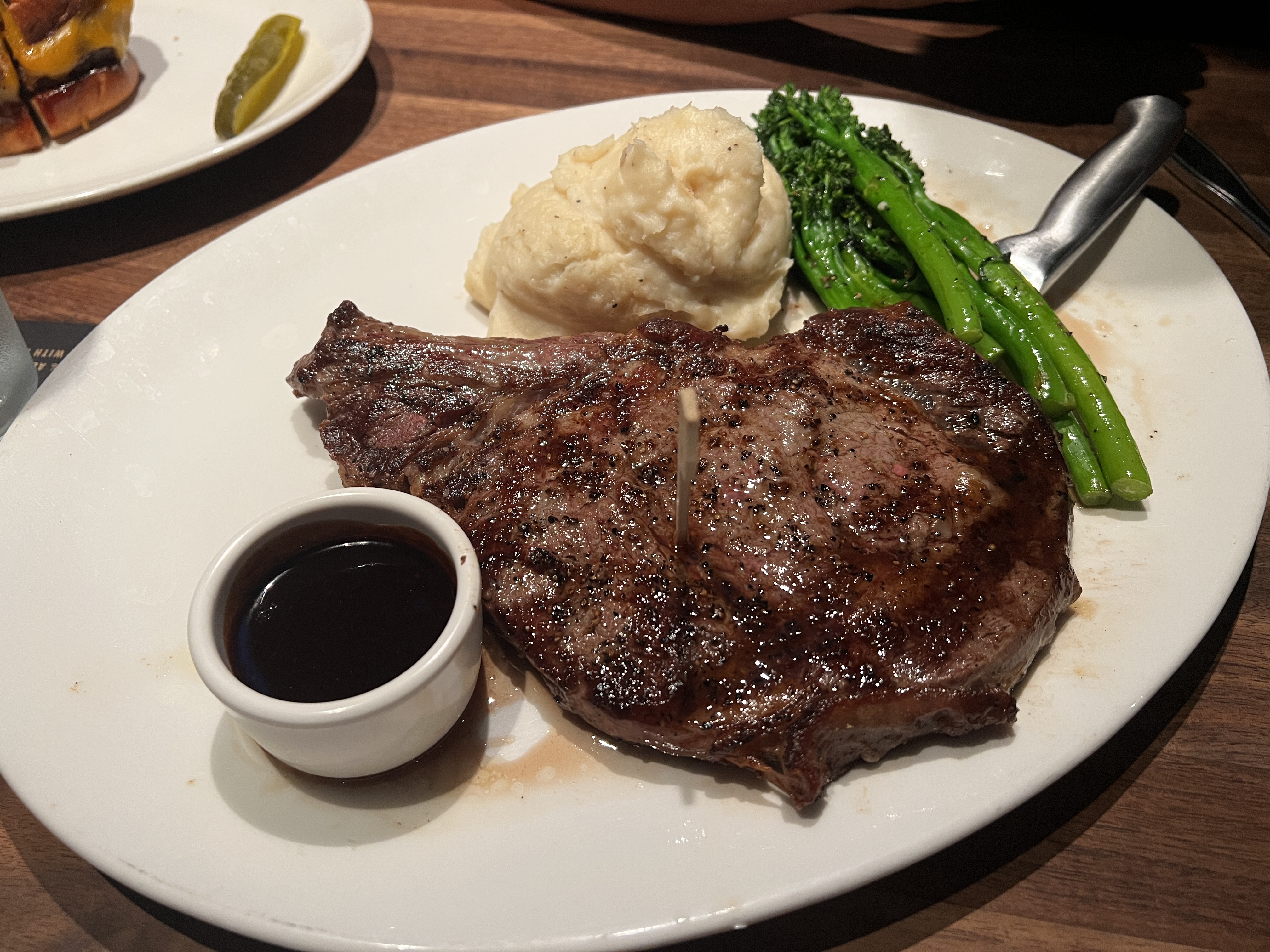 둘째가 하와이에 온지 하루가 지나고 계속해서 열이 났기 때문에 멀리 이동하는 대신 걸어서 갈 수 있는 거리로 이동했는데 이것마저도 열이 나는 아이에게는 힘든 일이었는지 도착해서 테이블을 잡자마자 아이는 잠이 들어버렸네요. 원래 Yard House의 해피아워에는 피자종류와 각종 에피타이저류가 50% 할인이었고 스테이크나 버거류는 할인하지 않았지만 스테이크와 버거 플렉스 했습니다.