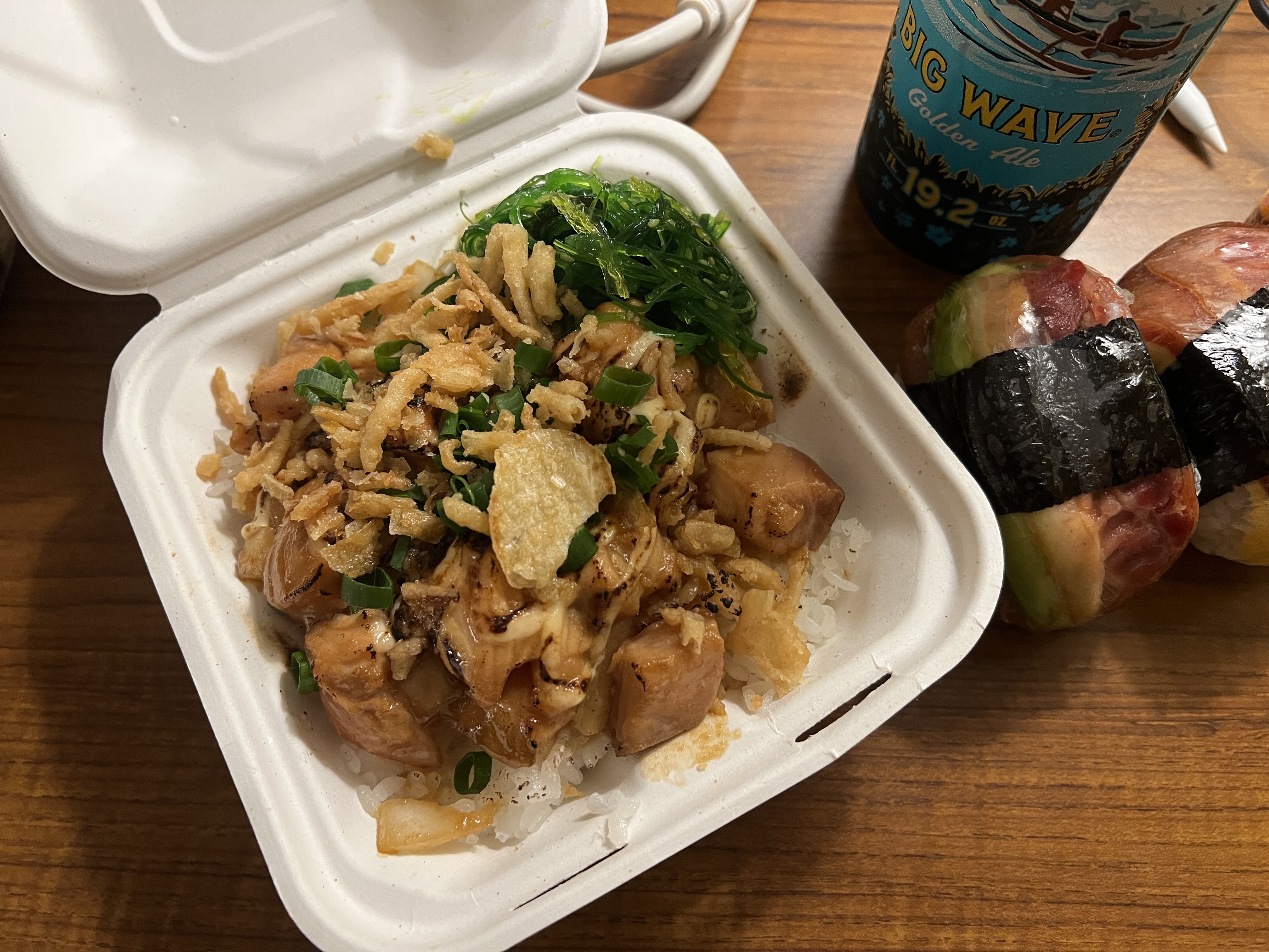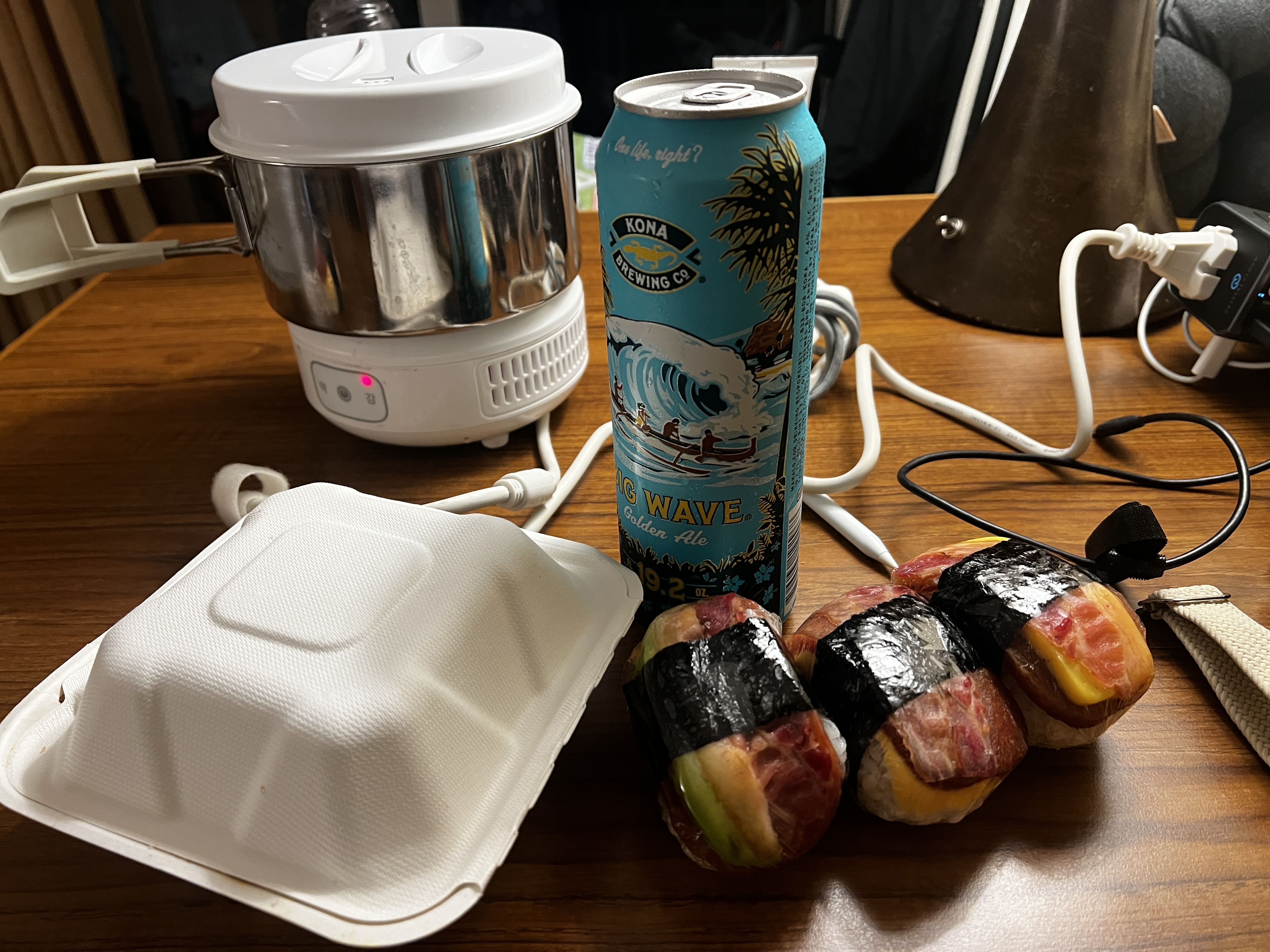여행을 갈 때마다 혹은 출장을 갈 때마다 챙겨가는 멀티쿠커에 라면을 끓이고 일전에 방문했던 무스비 카페에서 무스비를 몇개 사옵니다. 작년에 하와이 여행을 갔었던 친구의 추천으로 포케를 테이크아웃 해 왔는데, 개인적으로는 이틀차에 방문했던 마구로 스폿이 훨씬 맛있습니다. 포장용기도 여기는 종이로 되어있는 용기를 사용해서 나중에는 밥알이 붙어다녀 먹기가 조금 불편하기는 하더라구요. 마구로 스폿이나 이 가게나 와이키키 리조트 근처에 있기 때문에 방문해보셔도 좋을 것 같습니다.