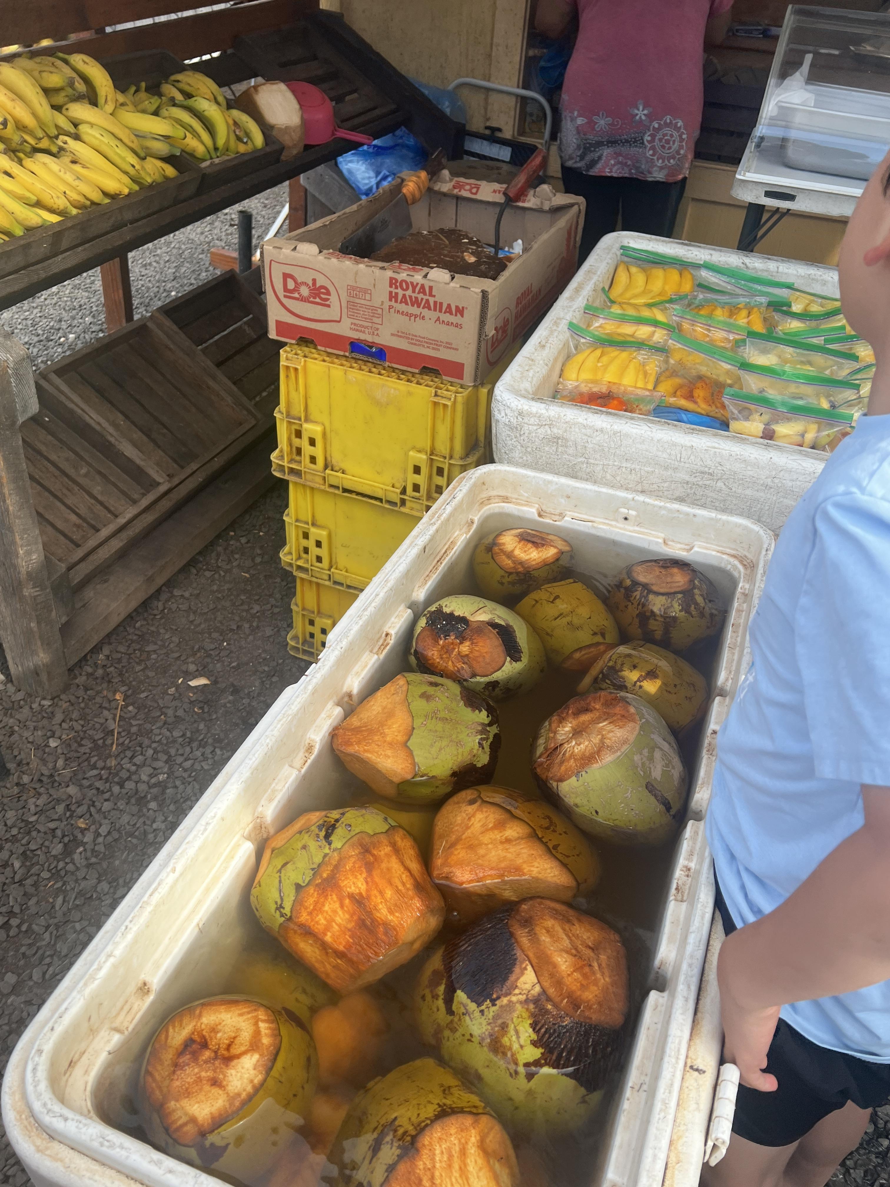 물놀이를 마치고 돌아오는 길에 보인 조그마한 가게가 예뻐서 멈춰봅니다. 옆에는 과일 노점상도 있었는데 커다란 중식도로 망고나 다양한 과일을 슥슥 잘라 코스트코 지퍼백에 넣어서 판매를 합니다. 마침 열이 있어 기운이 없던 첫째님이 (둘째는 멀쩡하고 첫째님이 아프기 시작하심) 코코넛 먹어보는 것이 위시리스트에 있다기에 그냥 한번 사줘봤습니다.