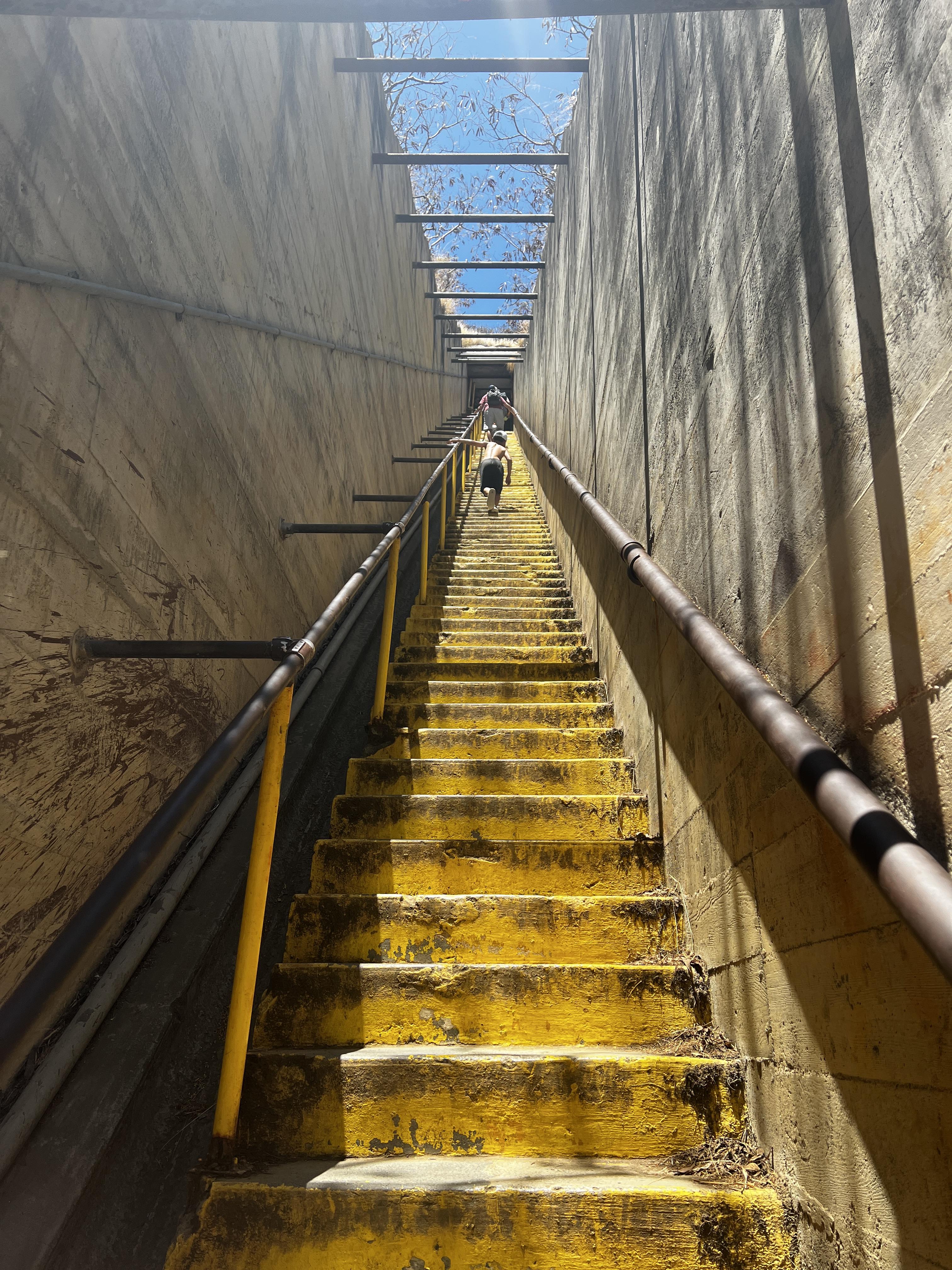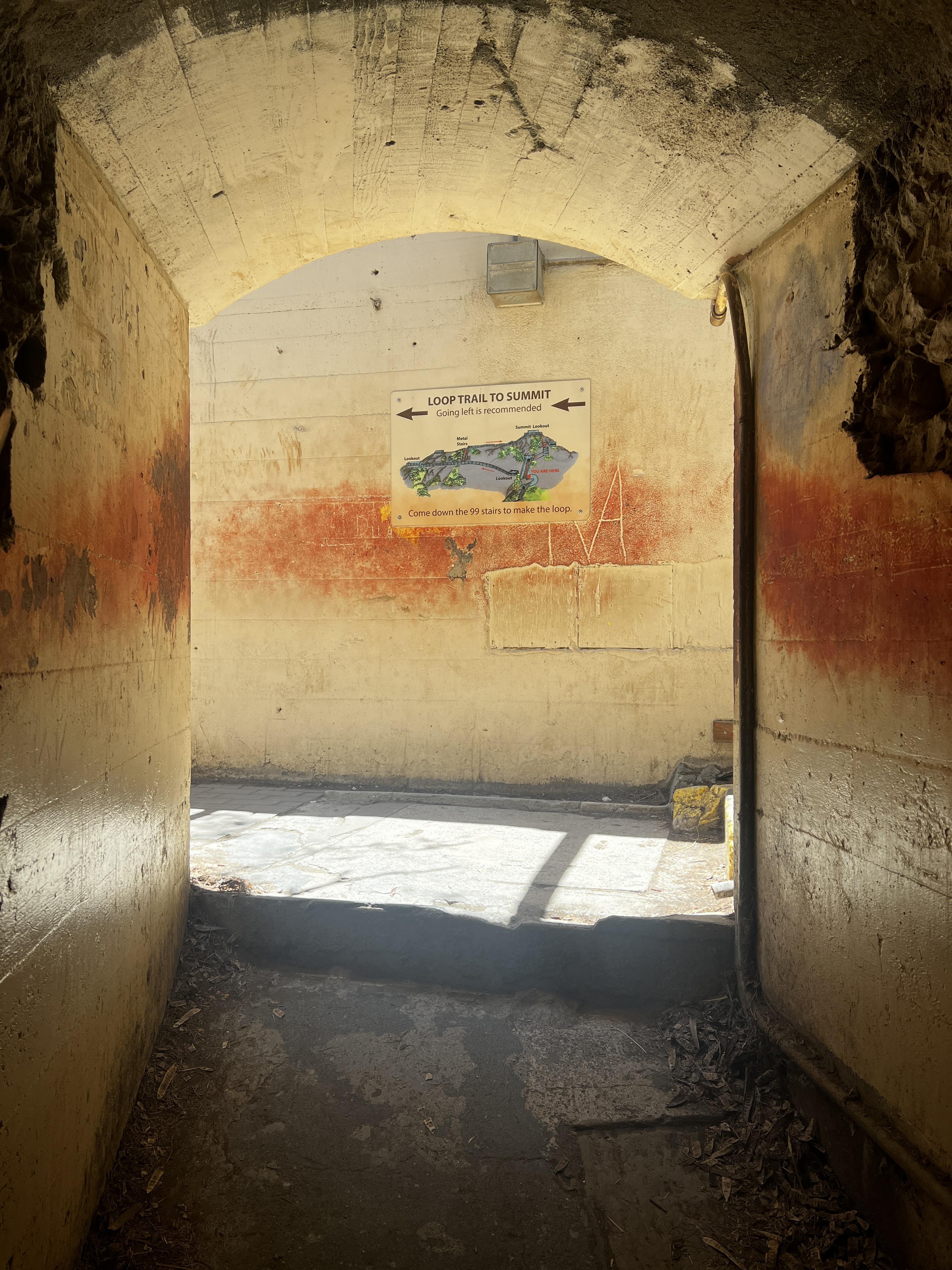 여기서 왼쪽으로 가도 오른쪽으로 가도 정상으로 갈 수는 있습니다. 먼저 간 둘째님이 오른쪽으로 바로 올라가는 바람에 지옥의 99계단을 올라갔는데, 나중에 내려올 때 보니 반대쪽으로 갔어도 계단으로 올라갔어야 하더라구요. 차라리 조금 더 그늘지고 시원했던 오른쪽 길이 나았던 것 같네요. 끝까지 올라가면 너무 숨이 차서 숨이 막히지만 곧 시원한 바람이 불어옵니다. 약간 층고가 낮은 조그마한 공간이 나오는데 나중에 알고보니 총격대(?)라고 하더라구요.