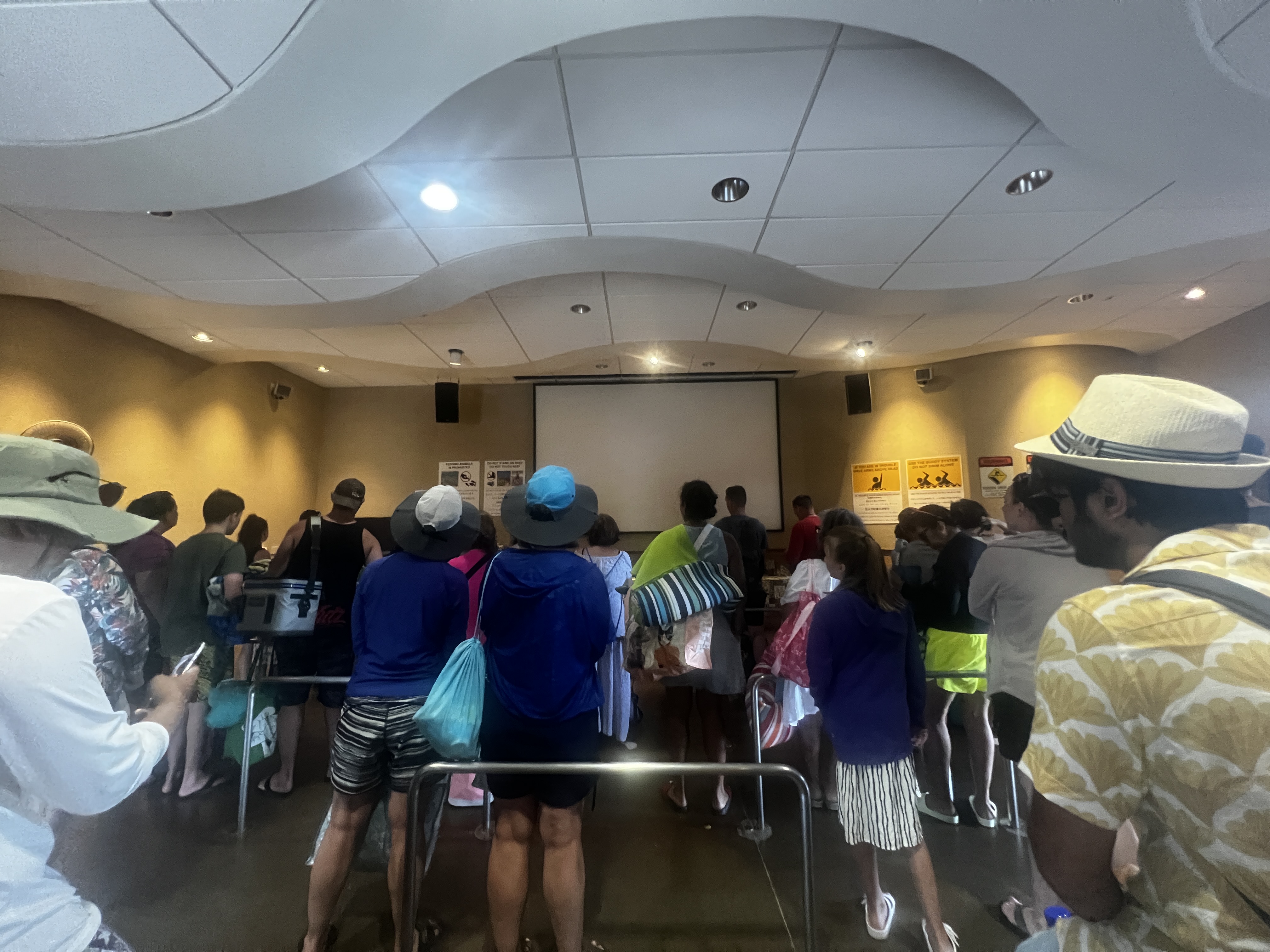 Hanauma라는 뜻이 저렇게 움푹 들어간 바다를 의미한다고 하네요. 중요하게 보호되고 있는 지역인지라 들어가기 전에 의무적으로 교육을 받고 들어갑니다. 자원봉사자가 오셔서 어떤어떤 교육을 받을 것인지 설명해주시고 궁금한 것이 있는지 물어본 후, 장소를 이동하여 비디오를 통한 교육을 받게 됩니다. 시간은 그리 길지 않아서 약 10분 남짓 소요되는 것 같아요.