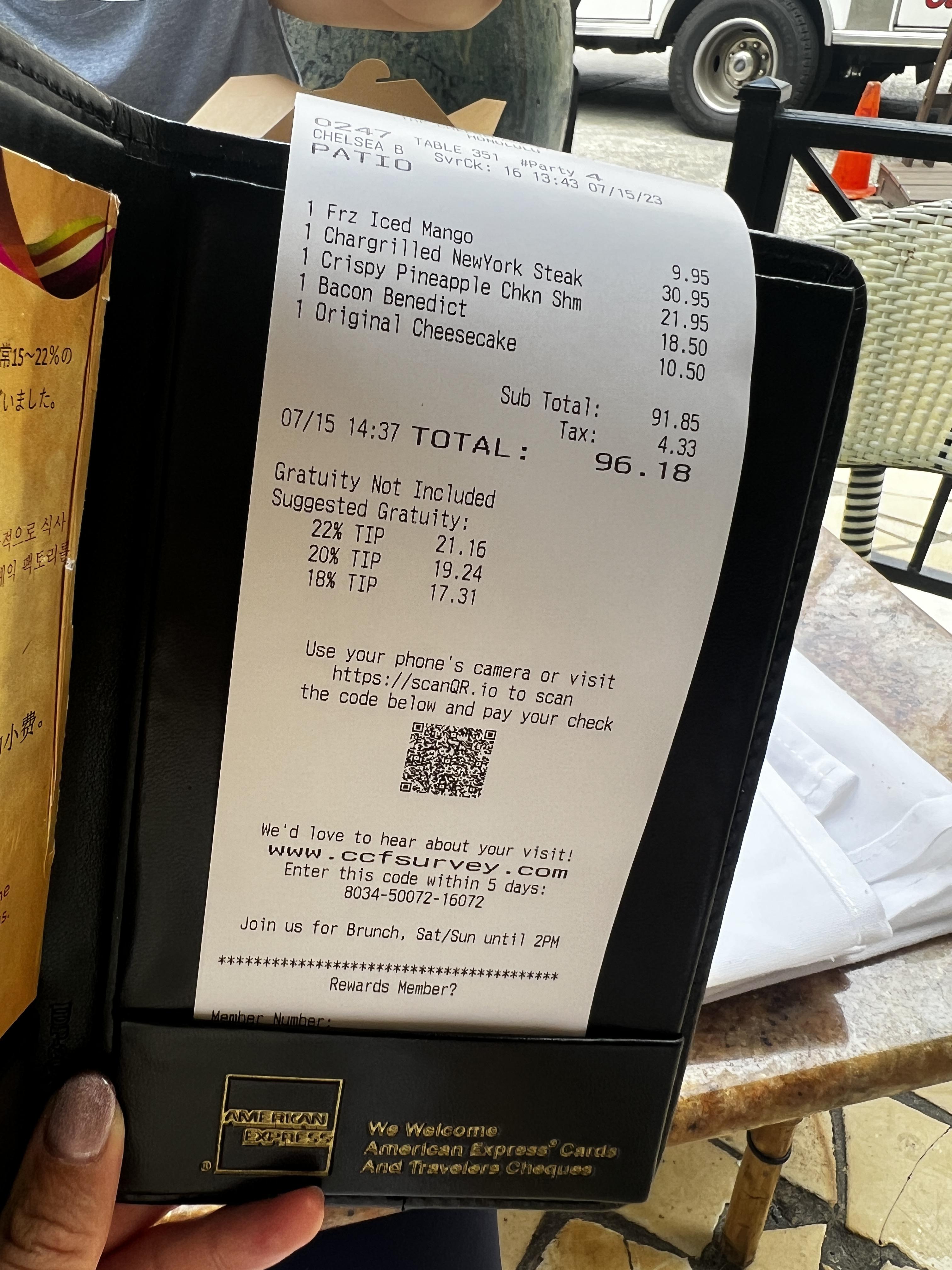 식전빵이 나오는데 의외로 식전빵이 참 맛있습니다. 아이들이 먹고싶다던 망고주스와 뉴욕 스테이크, 에그 베네딕트, 슈림프와 디저트로 오리지널 치즈케이크 1조각을 추가했는데 100$ 못미치는 금액이 나왔네요. 넷이 갔는데 메뉴를 2개만 주문하기가 좀 그래서 3개를 주문했는데 마지막 메뉴는 거의 먹지 않고 포장해왔습니다. 여기서도 Box를 달라고 하면 테이크아웃용 박스를 주기 때문에 음식이 남으면 포장해오시면 됩니다. 하와이 물가도 비싼데 아이들 하나라도 더 먹이려면 굳이 버리고 올 필요는 없으니까요.