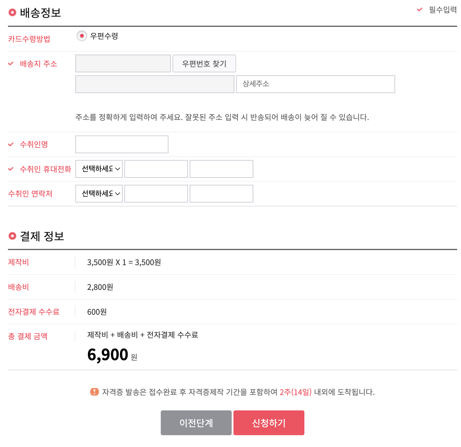 주민등록번호와 간단한 개인정보, 자격을 받을 주소 등을 입력하며 결제정보를 확인할 수 있습니다 제작비와 배송비에 전자결제 수수료까지 총 6,900원을 지불한 후, 신청하기를 마무리 해 봅니다. 자격증은 약 2주 후에 배송이 된다는 메시지가 나오는데 만약 신청은 했지만 자격증 신청을 취소하고 싶으신 경우라면