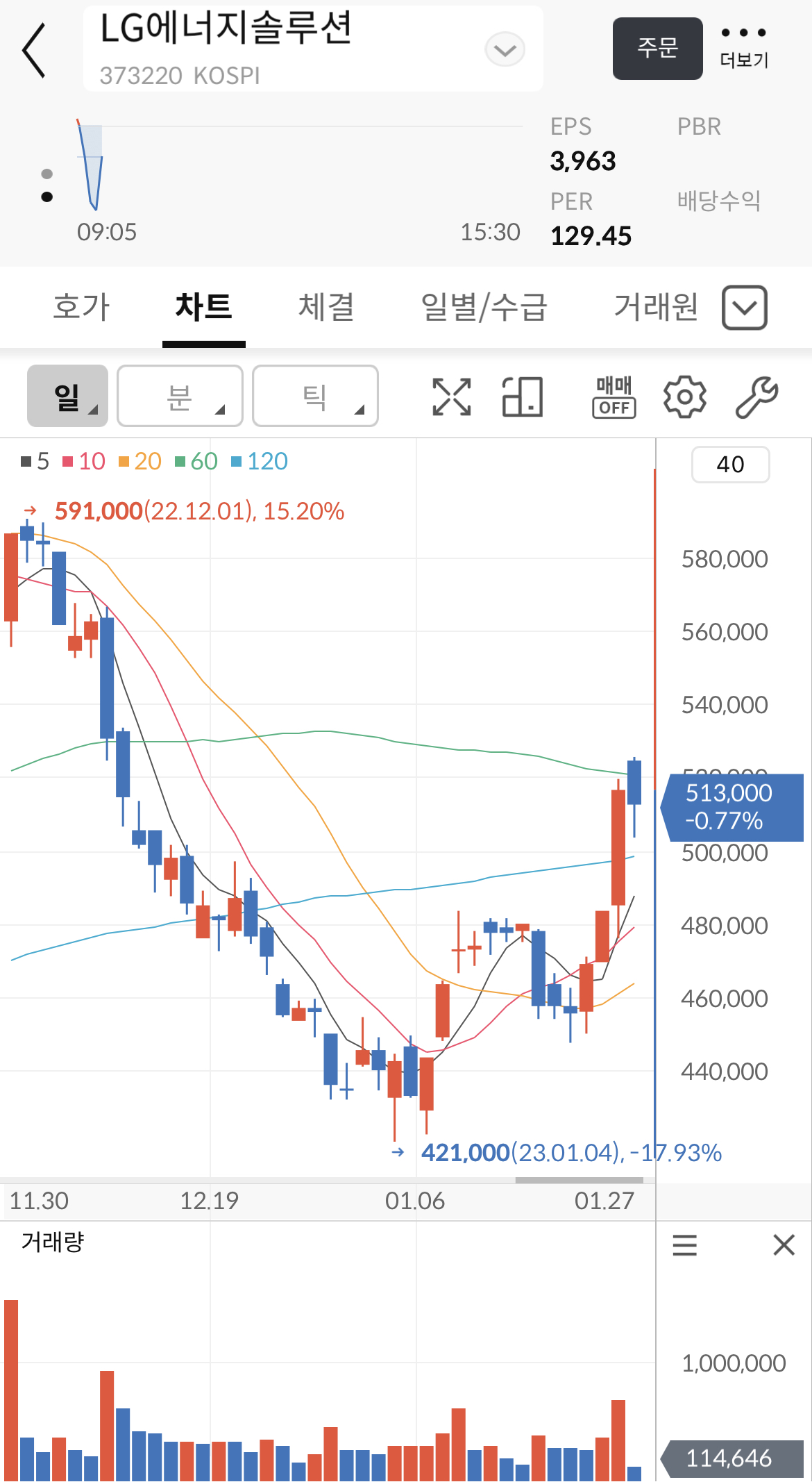 오늘자(1/27)로 다시 LG 에너지솔루션 주가를 확인해 보니 아주 그냥 쭉쭉 오르고 있네요 ㅎㅎ 물론 저는 공모주로 받았기 때문에 그 가격보다 손해를 보지는 않았지만 주가가 올라가는 타이밍을 맞추는 데는 영 소질이 없나 봅니다. 얼마 전 LG 에너지솔루션의 영업이익이 상당하다는 뉴스는 보았는데, 조금 늦게 매도할걸 하는 생각은 들었지만 그래도 3주 모두 팔아치우지 않은 것에 만족합니다.