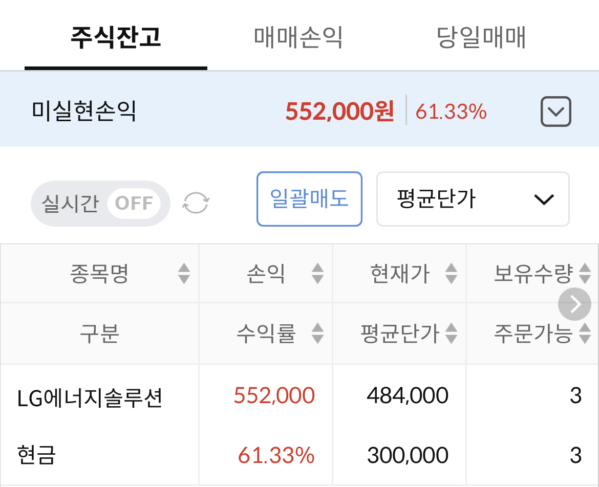 잔고현황은 공모주로 받았던 3주가 다였는데 총투자금이 900,000원 인 것을 보니 1주당 30만 원에 샀었나 봅니다. 하도 예전에 사둔 것이라 공모주 가격도 잊고 있었네요. 한동안 관심을 갖지 않고 두었더니 LG 에너지 설루션은 주가가 쭉쭉 올라 1월 25일에 485,000원에 2주 매도를 걸어보았습니다.