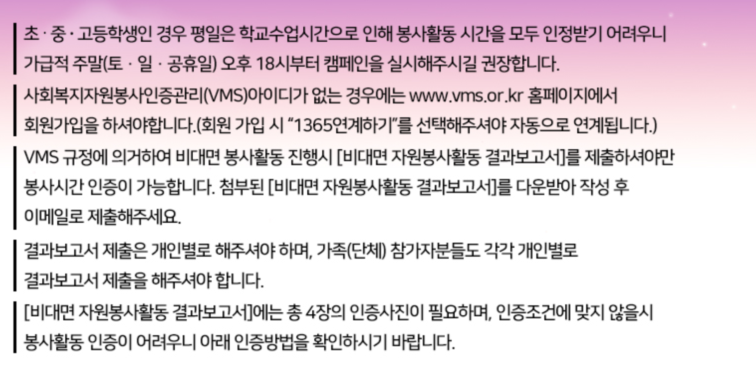 비대면 자원봉사활동에 대하여 결과보고서를 꼭 작성해야 하는 만큼 아래의 예시를 참고하셔서 작성하신 후, 이메일(91iclifeline@hanmail.net)로 제출하시면 된답니다. 봉사활동 승인여부를 메일로 회신해주신다고 하니 꼭 확인하셔서 봉사활동 인증받으시기를 바래요!