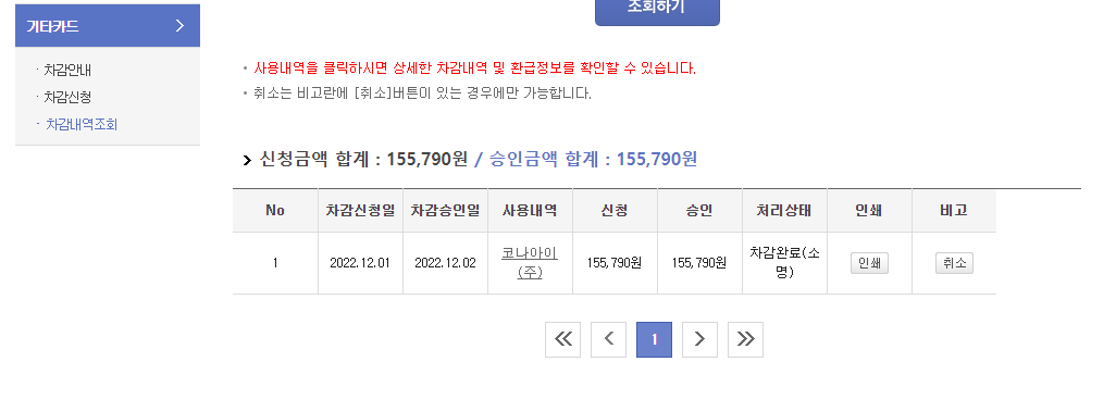 차감 신청에서 위와 같이 신청 후, 환급받으실 계좌번호를 넣어주시고 신청하면 끝입니다.