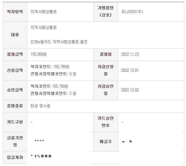 복지 항목은 '지역사랑 상품권'으로, 가맹점명은 '코나아이(주)'로 쓰시면 됩니다. e음 카드 어플을 쓰고 계시다면 저처럼 필요하신 포인트만큼(40만 포인트까지 충전 가능) 충전하신 후, 충전 내역을 캡처해둡니다. 저는 지급된 포인트가 40만포인트 이하라 가지고 있는 만큼 모두 충전해보았습니다.