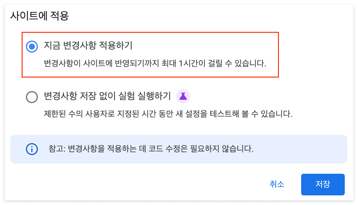 설정을 하고 저장을 하면 변경사항이 사이트에 반영되기까지 최대 1시간이 걸린다는 메시지가 나오면서 설정이 완료됩니다. 이로써 마치 '블로그 게시글 더 보기'와 같은 기능을 갖춘 광고를 노출할 수 있게 되었네요.