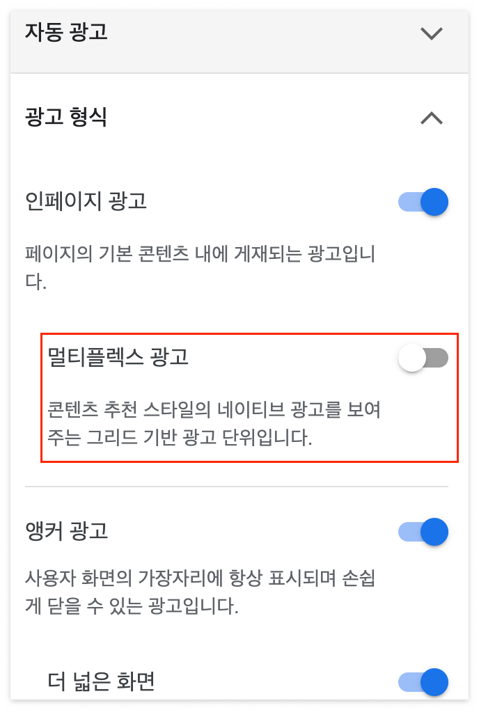 - 콘텐츠 내 자동 삽입 광고: 본문 중간에 '수동'으로 넣어줘야 하는 광고