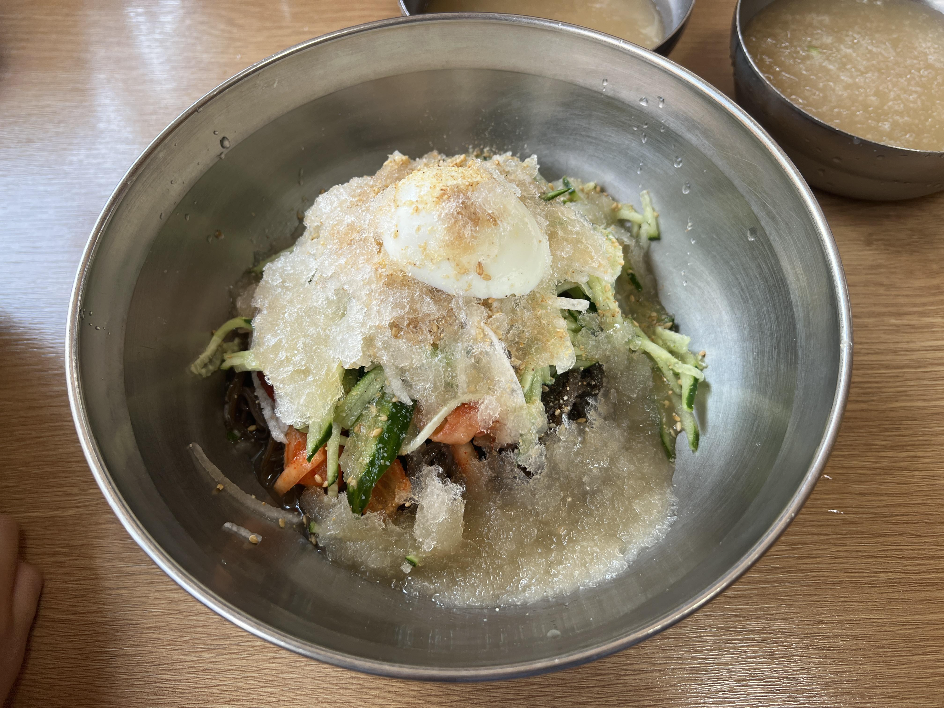 물냉면에도 매운 양념이 들어가 있기에 혹시라도 저처럼 매운 것을 잘 못 드시는 분들이라면 미리 양념을 빼거나 따로 덜어달라고 하시는 것도 좋을 것 같습니다. 아니면 비빔냉면을 주문해서 양념을 조금 덜어내시고 얼음 육수를 원하시는 만큼 부어서 먹어도 괜찮고요!
