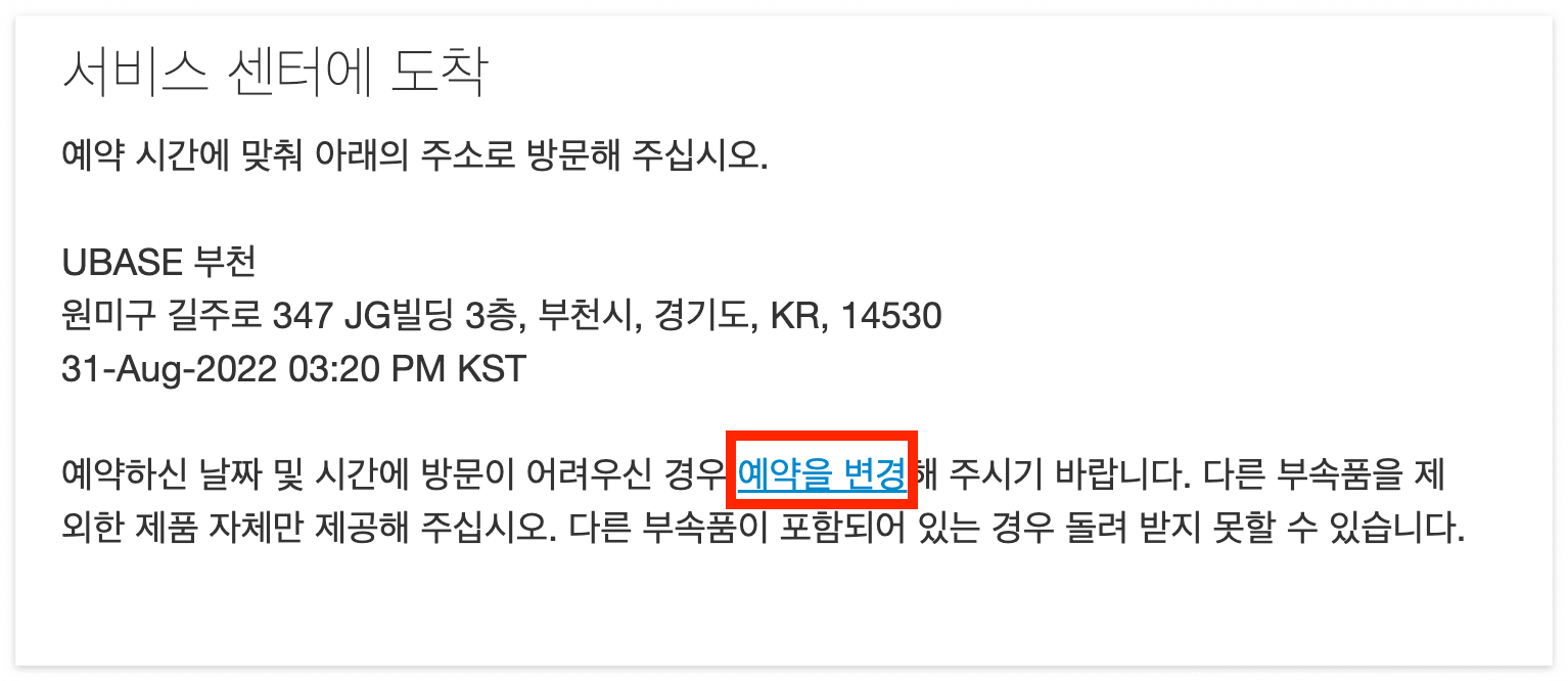 처음 애플 서비스센터에서 수리 방문 예약을 하시면 이메일이 한통 옵니다. 이메일을 열어보면 하단에 '예약을 변경' 부분에 파란색으로 표시가 되어 있는데요. 이 부분을 누르시면 예약 변경 페이지로 바로 이동할 수 있게 됩니다. 다만, 이 버튼을 눌러도 이동이 안되는 경우에는 애플 서비스 홈페이지에 접속하셔서 예약을 변경/취소하시면 됩니다.