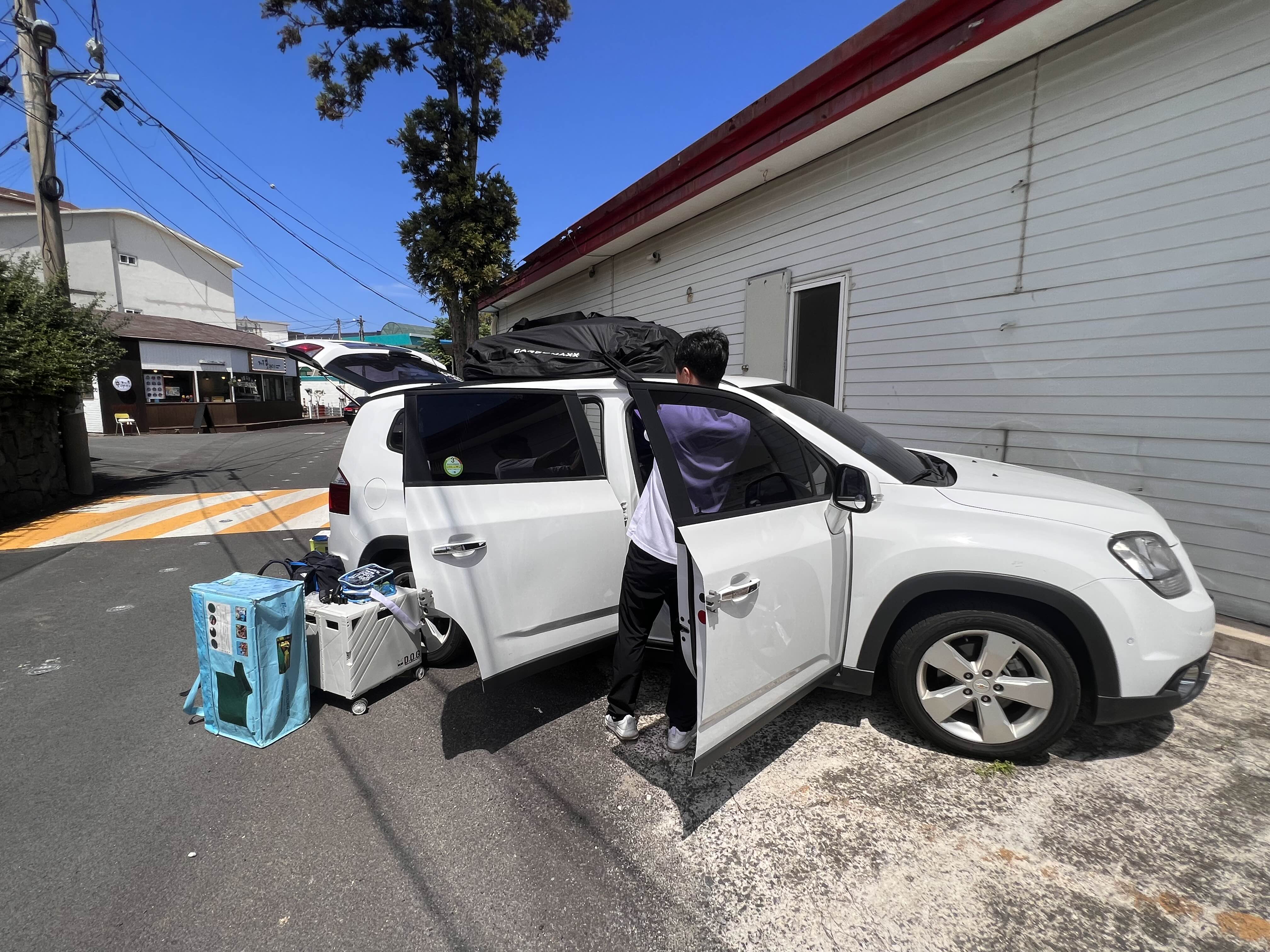 카페 패스를 구입하면서 '그린 앰버서더 서약'이라는 것을 했더니 커피 1잔을 추가로 증정해주었습니다. 제주를 사랑하고 제주를 살리는 여행자가 되고 싶었거든요. 카페패스를 사용할 카페에 들르는 동안, 잠시 차에 있는 짐을 정리합니다. 차량 위쪽에 짐을 올릴 수 있는 가방을 일전에 코스트코에서 사 두었는데, 이번에 요긴하게 사용하네요. 가져온 짐이 뒷좌석까지 점령하고 있기에 뒷좌석 활성화를 위해 짐을 위로 올려줍니다.