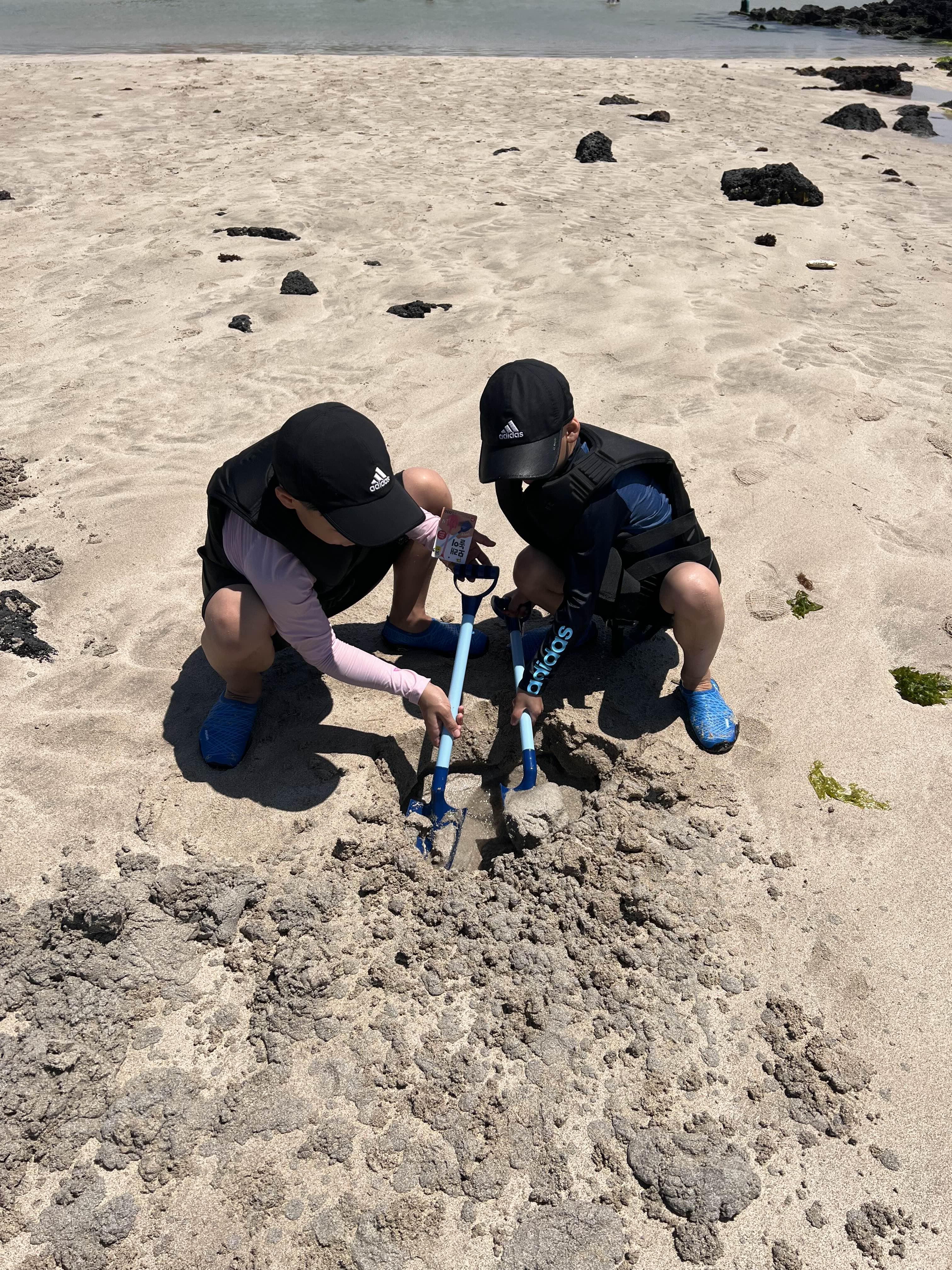 바다에 가자고 난리난리인 아이들을 위해 가장 가까운 함덕해수욕장으로 자리를 옮겨보았습니다. 날씨도 좋은데 썰물 때라 저 멀리까지 나가서 놀 수 있었어요. 바다생물도 많아서 아이들이 이것저것 잡고 놀기도 하고, 가져온 다이소 득템 물건인 삽을 이용해서 모래를 파기도 하고, 한 3시간은 놀았던 것 같아요.