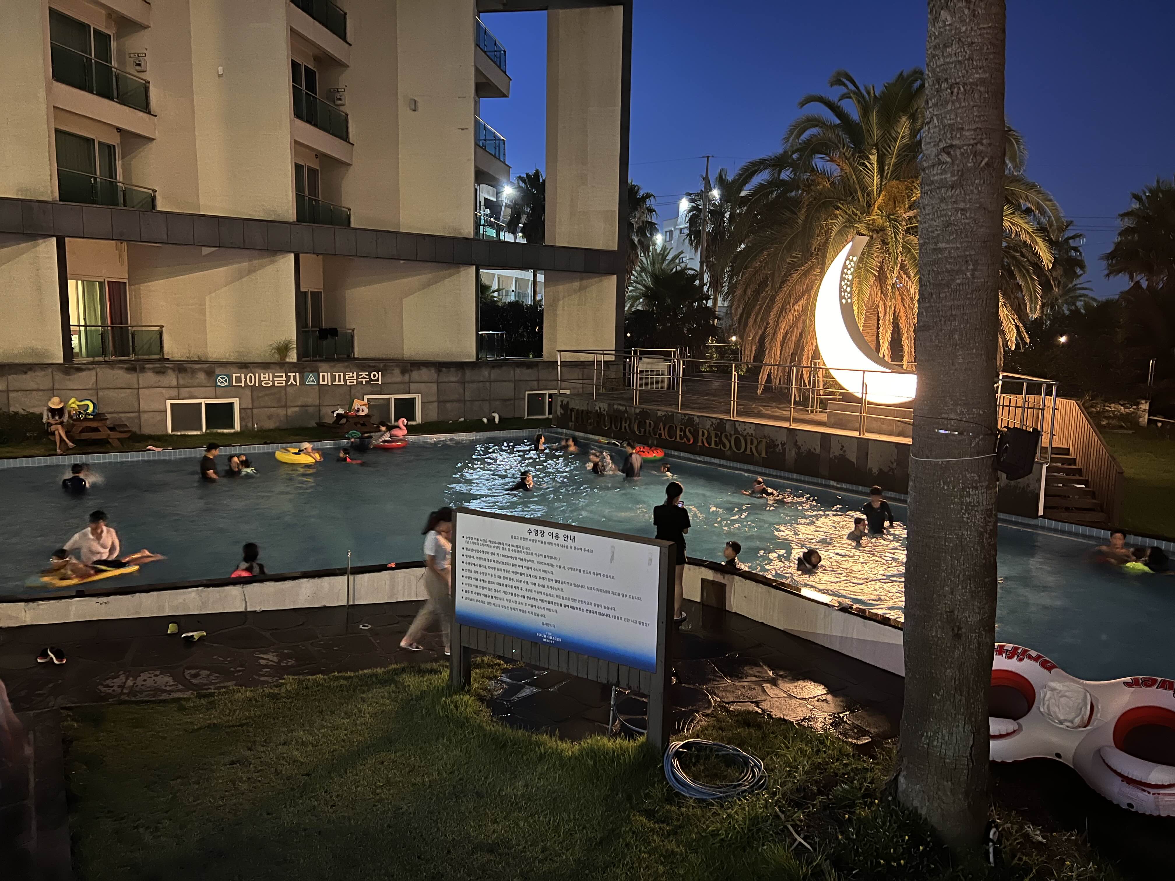 밤이 되면 이렇게 수영장 가운데 큰 달이 뜹니다. 너무 예뻐서 한 장 찍어보았는데, 그새 아이들은 또 수영하러 나가자고 성화여서 수영을 하게 해 주었습니다. 수영장 이용시간이 오전 10시부터 오후 9시까지라 물놀이 좋아하는 아이들은 정말 여기서 실컷 수영하고 놀 수 있답니다.