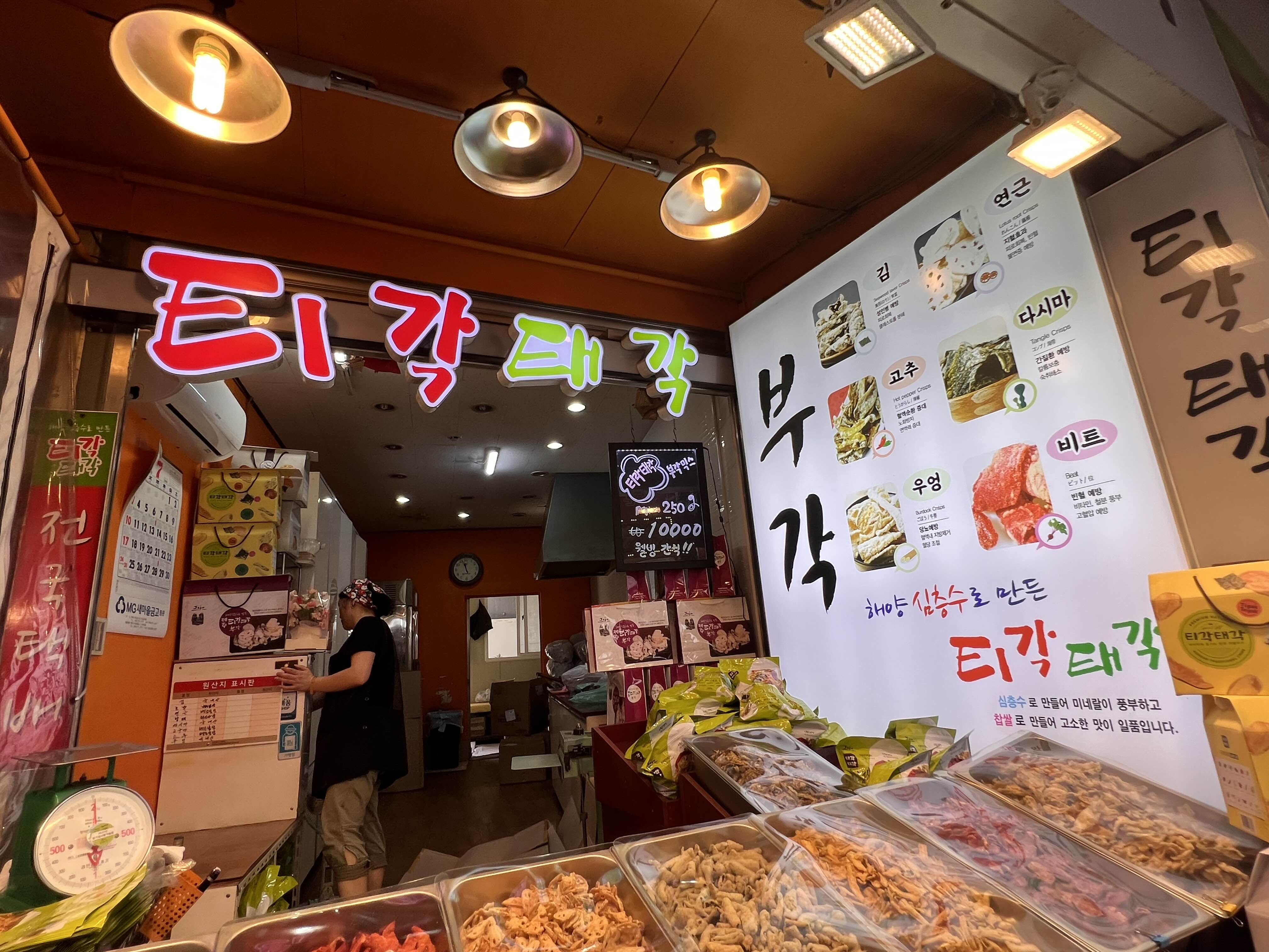 아침을 그렇게 먹었는데도 뭔가 먹고 싶은 아이들을 위해 먹거리를 사러 동문시장에 들렀습니다. 제주도에 올 때마다 늘 오는 곳이고 늘 같은 것만 사기 때문에 머무는 시간은 얼마 걸리지 않았네요. 초입부터 이것저것 맛있어 보이는 먹거리를 많이 판매하는데, 저희 아이들은 제주도 흑돼지로 만든 족발을 제일 좋아하기에 정육점에서 족발을 구매했어요. 앞다리 1개에 20,000원입니다. 부각을 특히 둘째가 좋아하여 부각도 1 봉지 샀고요.