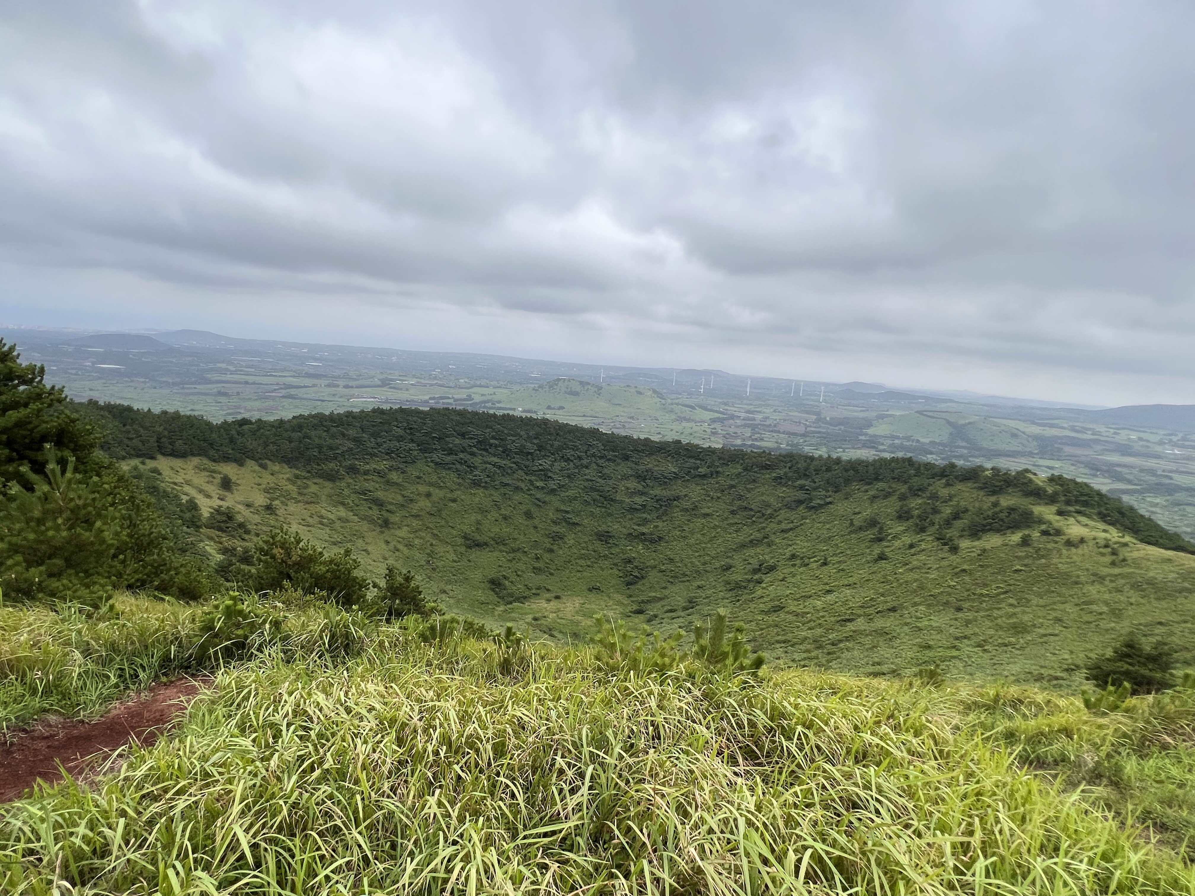 어느덧 정상에 온 승리자들. 마그마 분출로 생긴 분화구를 보며 바람을 맞으니 참 시원하고 좋습니다. 올라올때는 그리도 힘들었는데 올라오고 나니 기분은 좋네요. 날이 조금 흐려서 더 수월하게 올라왔는지도 모릅니다. 아무래도 나무가 울창하거나 하지는 않아서 쨍쨍한 날 오기는 힘들 것 같아요. 다랑쉬오름은 올라갔다가 내려오기까지 약 1시간 반정도 걸렸습니다.