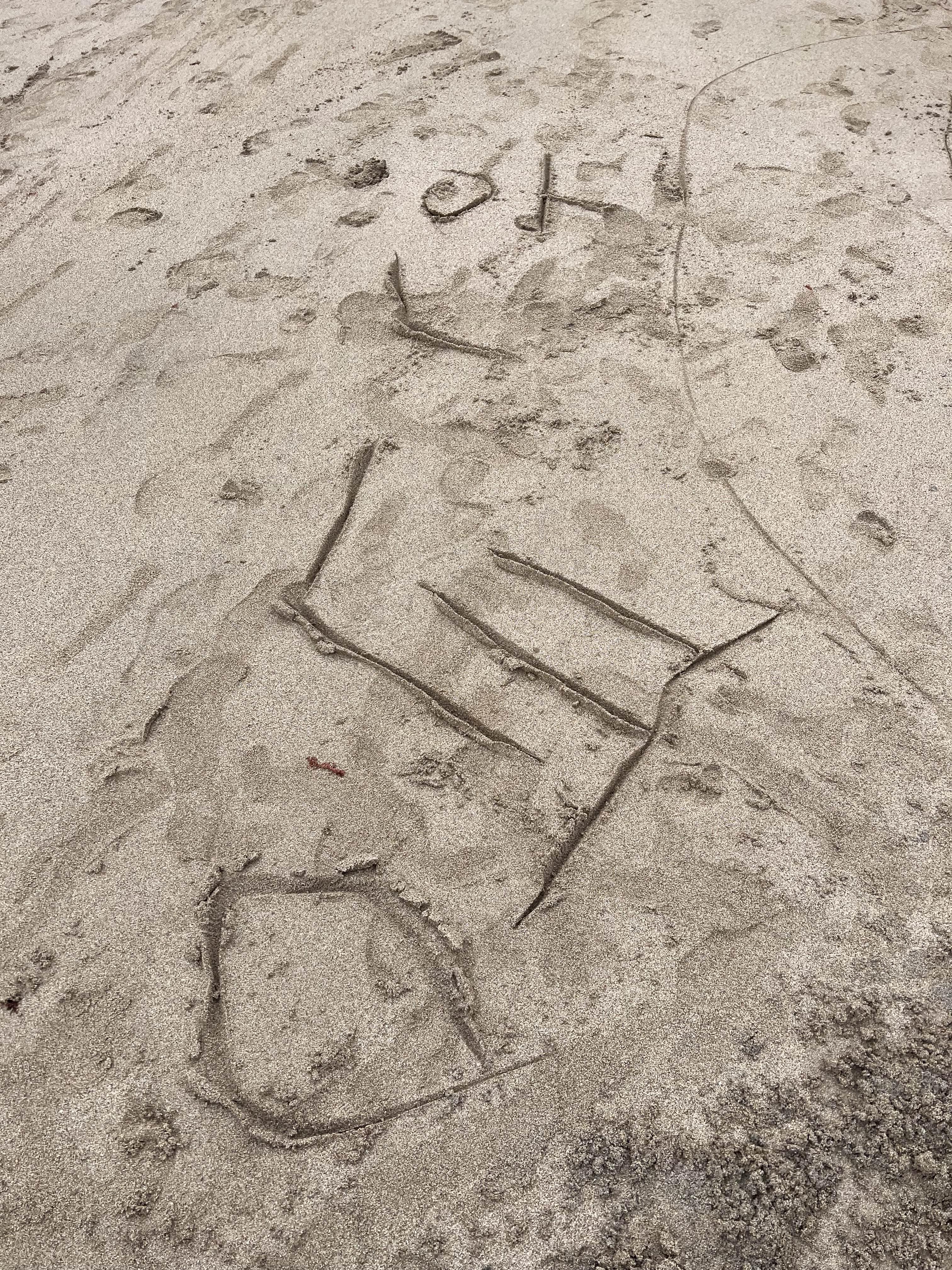 사람 북적이는 해변도 재미있지만, 사람 별로 없고 한가한 해변에서 노는 것도 즐겁습니다. 가져온 다이소 삽으로 구덩이도 파고, 글씨도 쓰고 한두시간 재미있게 놀다가 숙소로 다시 향합니다. 바닷물에 쩔은 아이들을 커다란 봉지에 그대로 넣어 모셔왔습니다. 남편이 준비한 커다란 비닐봉지가 이럴 때 빛을 발하네요.